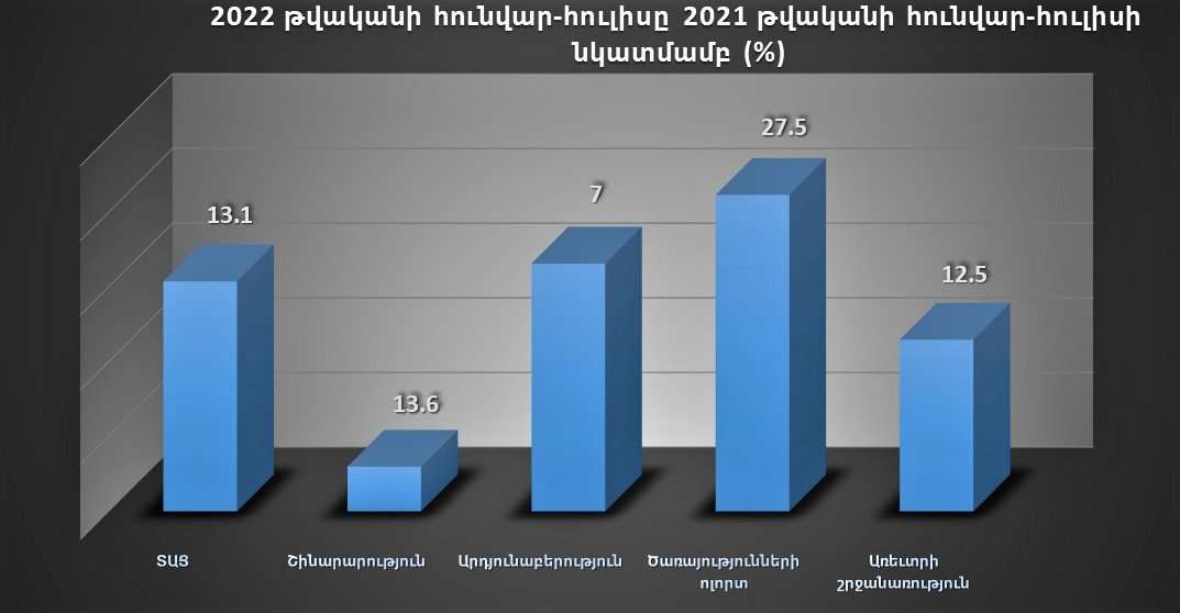 The Ministry of Finance of the Republic of Armenia informs that the economic activity indicator in Armenia increased by 13.1 percent in January-July 2022 compared to the same period of the previous year.
