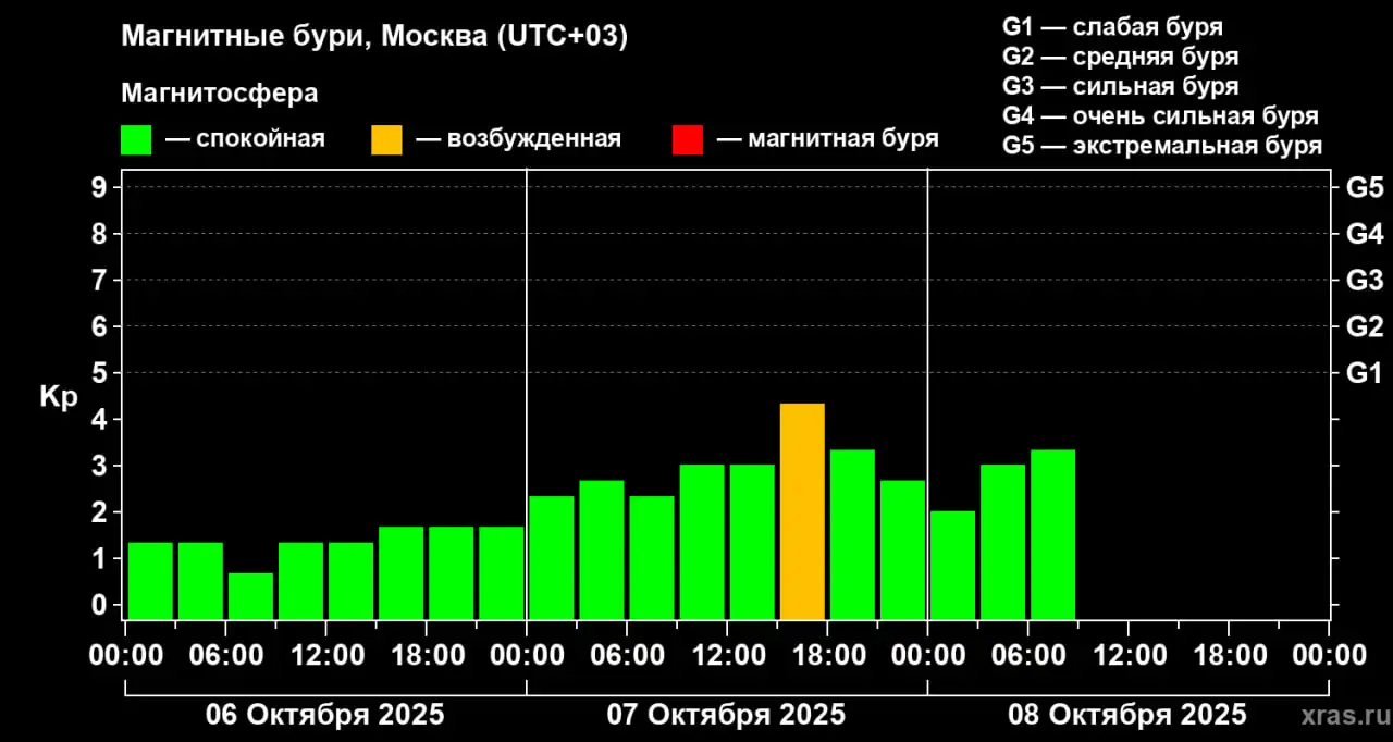 Experts from the Russian National Academy of Sciences have reported that the probability of geomagnetic disturbances and weak magnetic storms will persist on October 8.