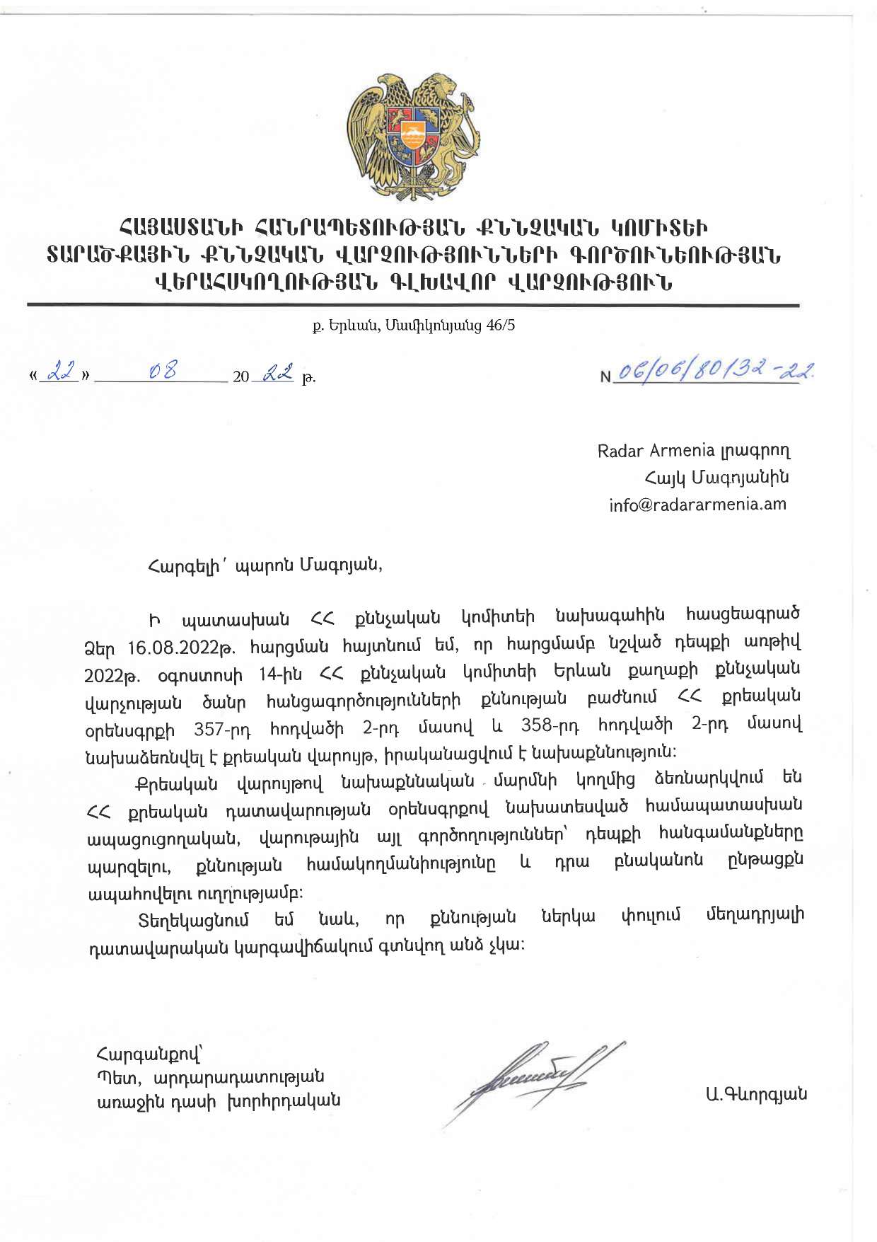 To our question, will Razmik Zakharyan, the owner of the "Surmalu" shopping center, be held accountable, and if not, who will be held responsible? The RA Investigative Committee answered: "2022 On August 14, criminal proceedings were initiated by Part 2 of Article 357 and Part 2 of Article 358 of the Criminal Code of the Republic of Armenia in the Department of Serious Crimes of the Investigative Department of the City of Yerevan of the RA Investigative Committee, and a preliminary investigation is being carried out.