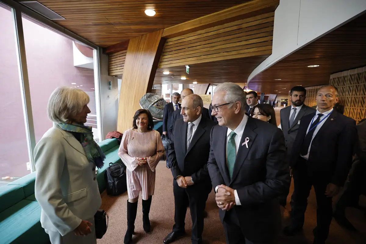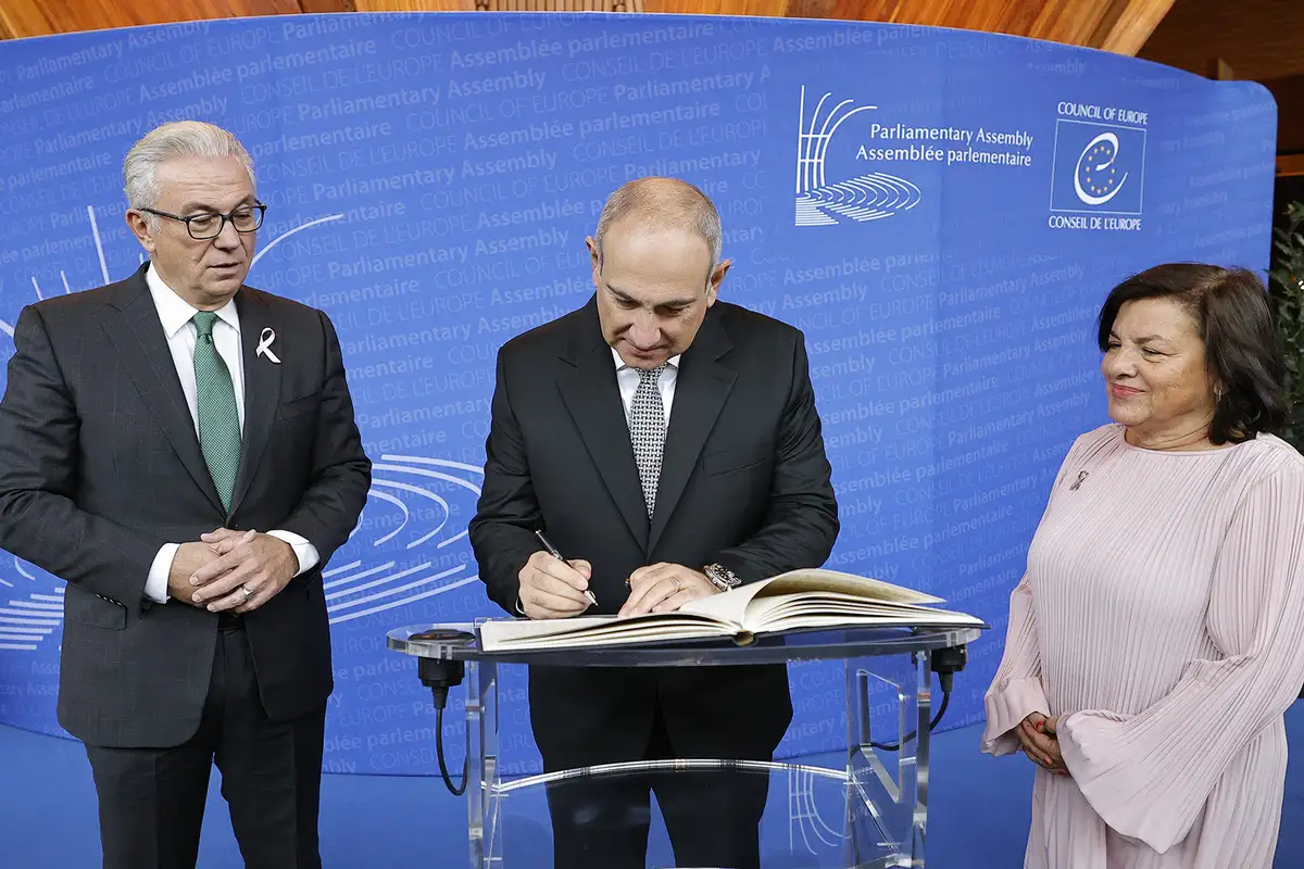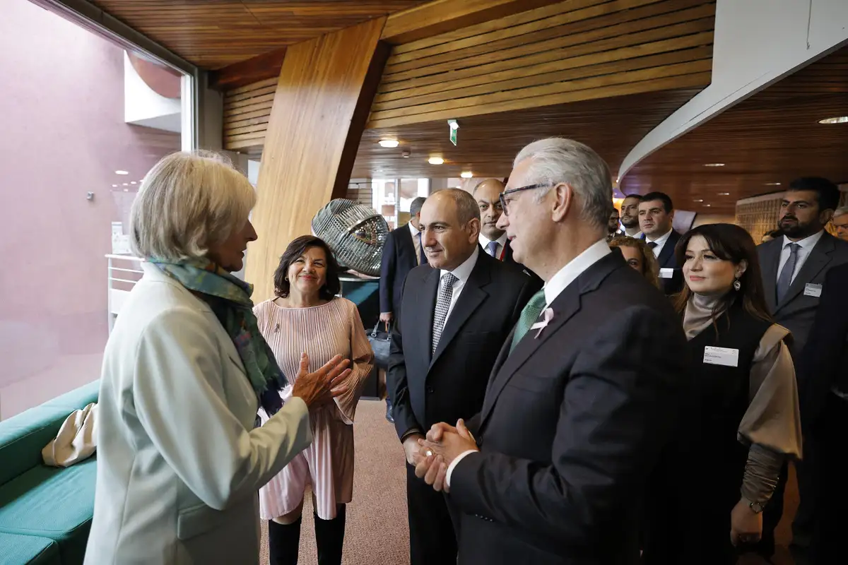 The Prime Minister was welcomed at the entrance by the PACE President and the PACE Secretary General, Despina Chatzivassiliou, after which Nikol Pashinyan made an entry in the PACE President's "Golden Book" and took a brief tour.