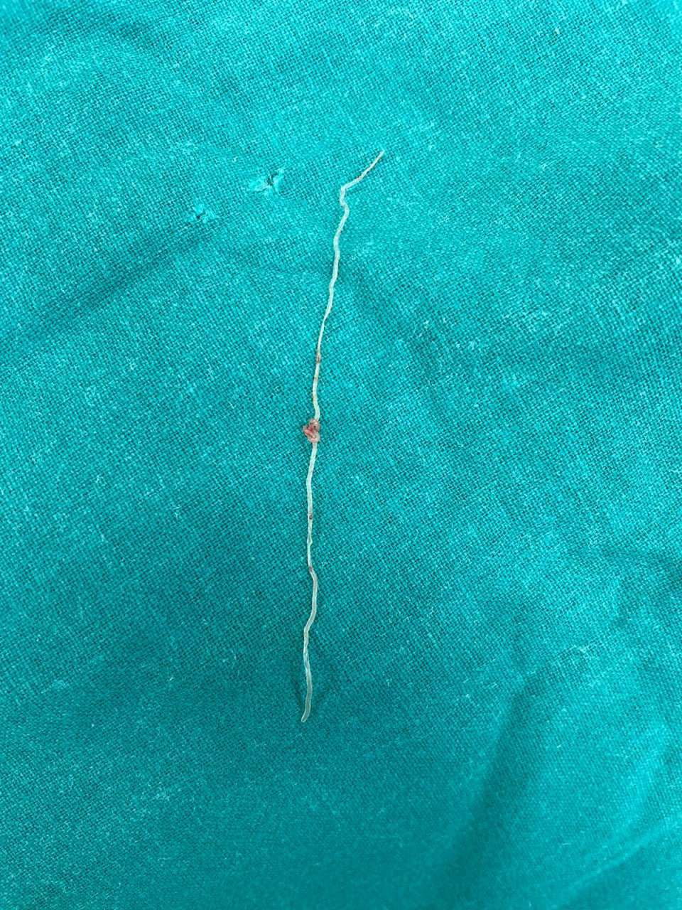 The photo shows a 12-centimeter worm removed from a Muscovite's cheek. The parasite appeared there after a mosquito bite.