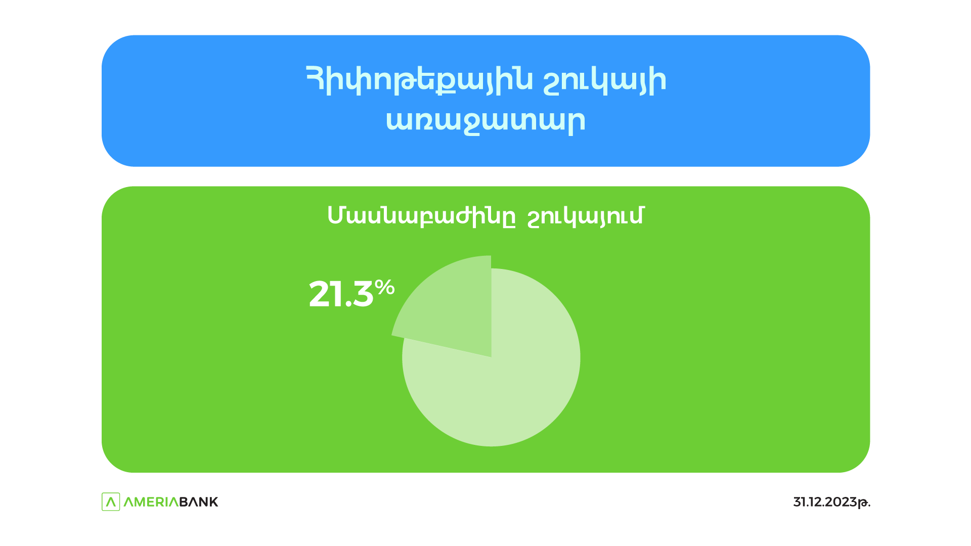 Ամերիաբանկը հիփոթեքային վարկերի պորտֆելի ծավալով պահպանում է բացարձակ առաջատարի դիրքը Հայաստանի բանկային համակարգում՝ 21,3% մասնաբաժնով (31.12.2023 թ․):