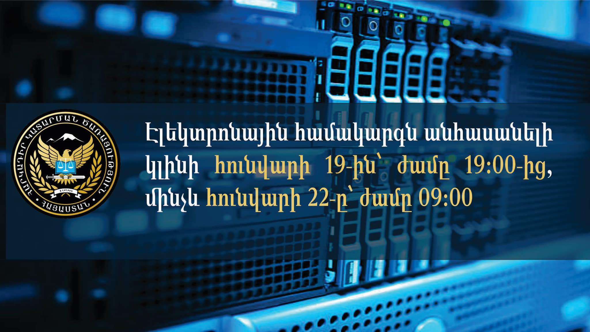 Հարկադիր կատարումն ապահովող ծառայության սերվերային համակարգում տեխնիկածրագրային աշխատանքներ իրականացնելու նպատակով Ծառայության էլեկտրոնային համակարգերը (այդ թվում՝ վճարային) և հարթակները հունվարի 19-ին՝ ժամը 19։00-ից, մինչև հունվարի 22-ը՝ ժամը 09։00, կլինեն անհասանելի։