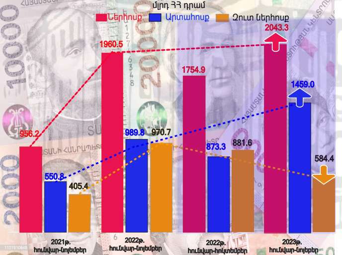 «2023թ. հունվար-նոյեմբերին ՀՀ բանկերի միջոցով ֆիզիկական անձանց անունով արտերկրից ստացվել է 2 տրլն 43․3 մլրդ դրամ, ինչը 82.8 մլրդ դրամով կամ 4․2 %-ով ավել է 2022թ. համապատասխան ցուցանիշից: