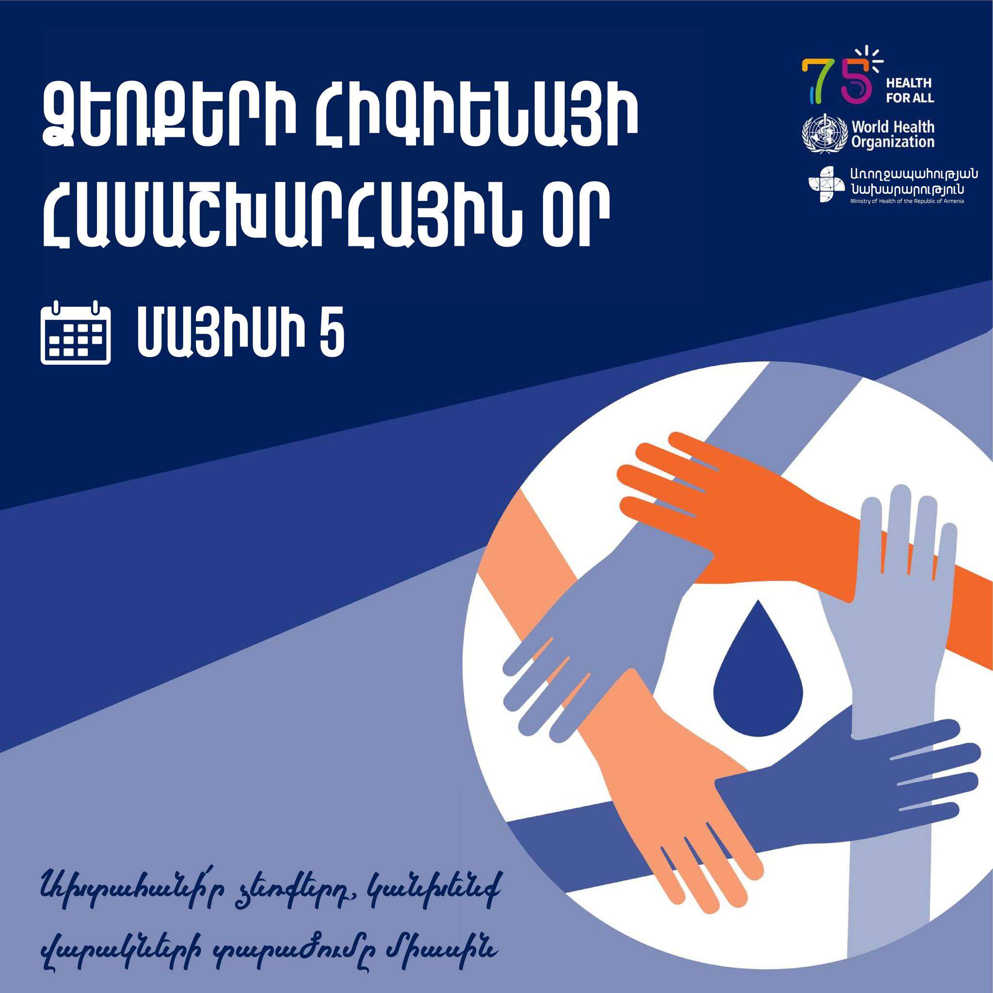 ՀՀ առողջապահության նախարարությունից հայտնում են, որ Առողջապահության համաշխարհային կազմակերպության այս տարվա կարգախոսն է՝ «Մշակե՛ք ձեռքերը, փրկե՛ք կյանքեր»: