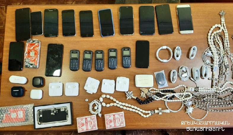 Խուզարկությամբ վերջինիս սպորտային պայուսակից հայտնաբերվել են 19 հատ տարբեր տեսակի բջջային հեռախոսներ, 9 ականջակալ, 10 USB լար, Wi-Fi սարք, 2 հատ բջջային հեռախոսի էկրան, 2 տուփ խաղաքարտ և 13 թզբեհ: