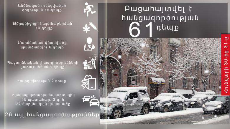 Ըստ ոստիկանության օպերատիվ հաղորդագրությունների ամփոփագրերի՝ հունվարի 30-ից 31-ը Հայաստանի Հանրապետության ոստիկանության ստորաբաժանումները բացահայտել են հանցագործության 61 դեպք, որոնցից 6-ը՝ նախկինում կատարված։