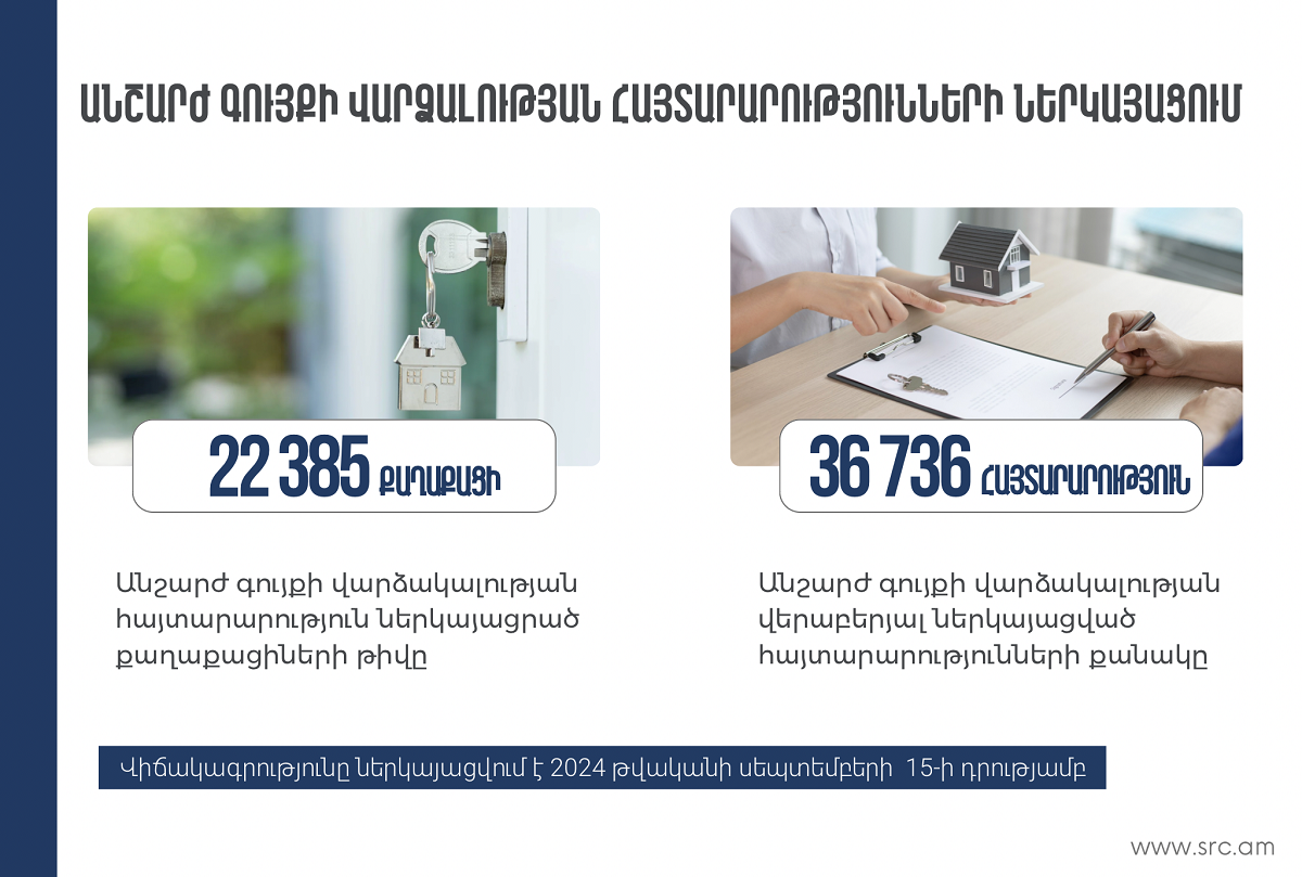 Պետական եկամուտների կոմիտեն տեղեկացնում է, որ 2024 թվականի սեպտեմբերի 15-ի դրությամբ, 22 385 քաղաքացի անշարժ գույքը վարձակալության տրամադրման վերաբերյալ օրենսդրությամբ սահմանված կարգով և ժամկետում հարկային մարմին է ներկայացրել անշարժ գույքի վարձակալության 36 736 հայտարարություն:
