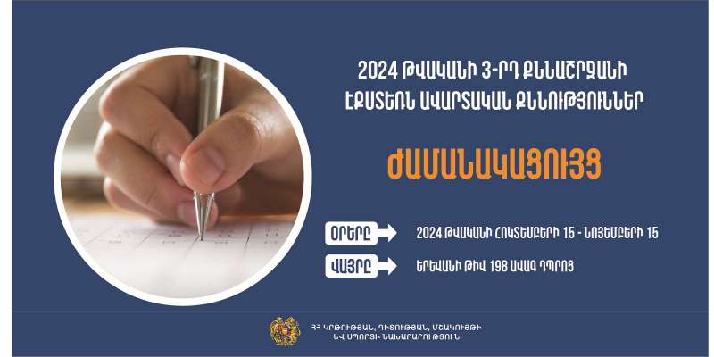 ԿԳՄՍ նախարարի հրամանով հաստատվել են 2024 թվականի 3-րդ քննաշրջանի դրսեկության ձևով (էքստեռն) ավարտական քննությունների կազմակերպման և անցկացման աշխատակարգը և ժամանակացույցը: