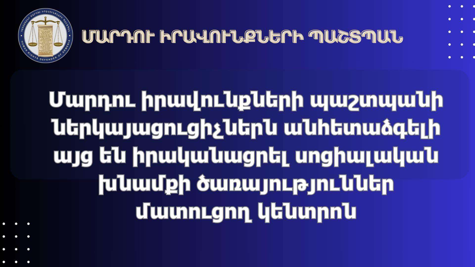 Մարդու իրավունքների պաշտպանի հանձնարարությամբ Պաշտպանի ներկայացուցիչներն անհետաձգելի այց են իրականացրել սոցիալական խնամքի ծառայություններ մատուցող կենտրոն: