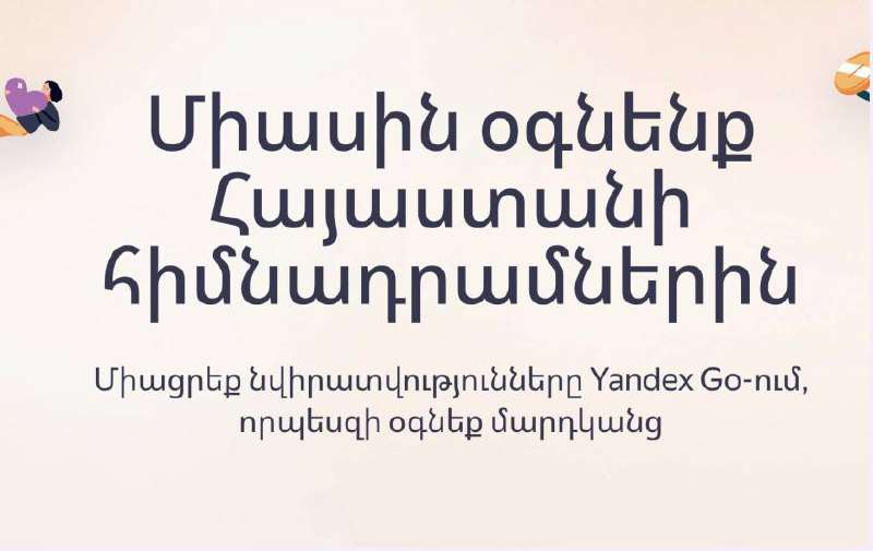 Այժմ Հայաստանում դուք կարող եք օգնել բարեգործական կազմակերպություններին Yandex Go հավելվածի միջոցով: Նոր «Օգնենք միասին» բաժնում օգտատերերը կարող են ընտրել, թե որքան գումար են ցանկանում փոխանցել աջակցության համար, որն էլ կավելացվի ընթացիկ ուղևորության արժեքին: Յուրաքանչյուր ամսվա վերջում Yandex Go-ն իր կողմից կկրկնապատկի նվիրատվությունների միջոցով հավաքված գումարը՝ մեծացնելով իր ներդրումը բարեգործական կազմակերպություններին։