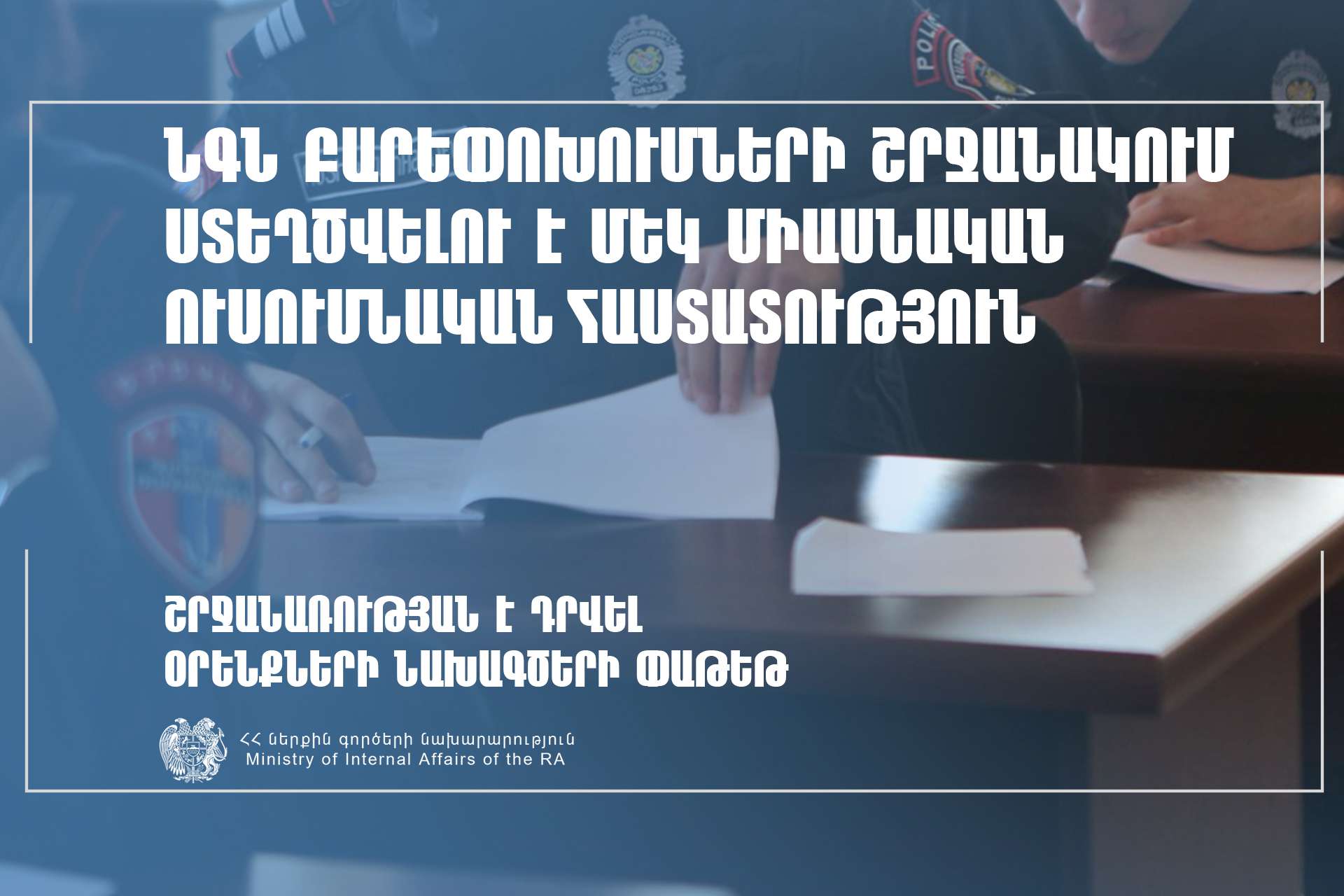 Ներքին գործերի նախարարությունը շրջանառության է դրել օրենքների նախագծերի փաթեթ, որով նախատեսվում է սահմանել ՆԳՆ ենթակայությամբ գործող միասնական ուսուսումնական հաստատության ստեղծման համար անհրաժեշտ օրենսդրական հիմքերը, ուսումնական հաստատության կառավարման միասնական արդյունավետ մոդելը և ապահովել ուսումնական գործընթացի կազմակերպման միասնական մեթոդաբանության ձևավորումը։