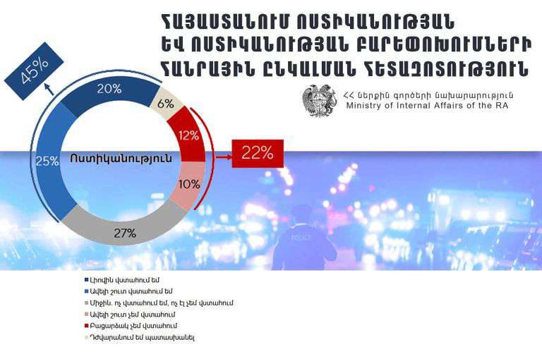 45% վստահությամբ Ոստիկանությունն իրավապահ կառույցներից շարունակում է մնալ առաջինը, որն հաջորդում են ԱԱԾ-Ն, ՊԵԿ-ը ՔԿ- ն, Դատախազությունը, Հակակոռուպցիոն կոմիտեն և դատարանները: