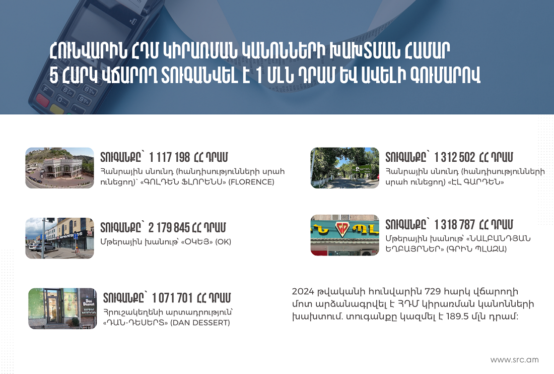 Հսկիչ դրամարկղային մեքենաների կիրառման կանոնների խախտման դեպքերով 1.0 մլն դրամ և ավելի տուգանք արձանագրվել է հետևյալ ոլորտներում.