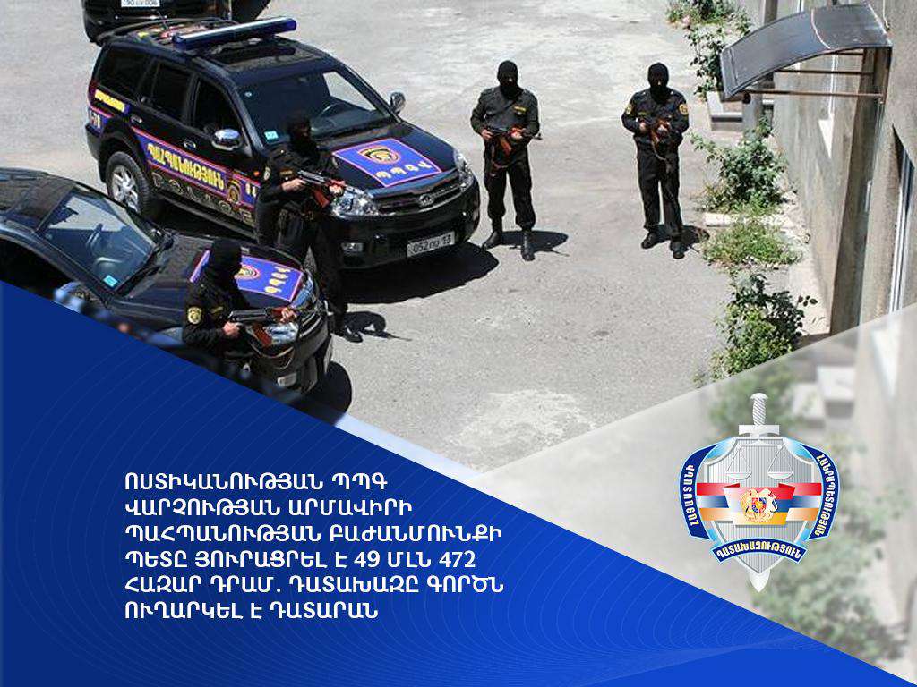Ոստիկանության պետական պահպանության գլխավոր վարչության (այսուհետ՝ ՊՊԳ վարչություն) Արմավիրի պահպանության բաժանմունքի նախկին պետ Խ.Ա.-ն 2013-ից 2018 թվականների ընթացքում մի խումբ անձանց օժանդակությամբ յուրացրել է 49 մլն 472 հազար 474 դրամ և կեղծել պաշտոնական փաստաթղթեր: