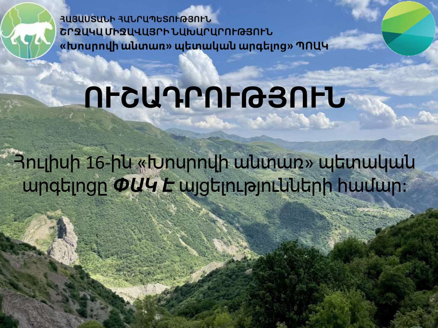 Հաշվի առնելով հանրապետության տարածքում բարձր կարգի հրդեհավտանգ ժամանակահատվածը՝ տեղեկացնում ենք, որ «Խոսրովի անտառ» պետական արգելոցը հուլիսի 16-ին փակ կլինի ցանկացած տեսակի այցելությունների համար:
