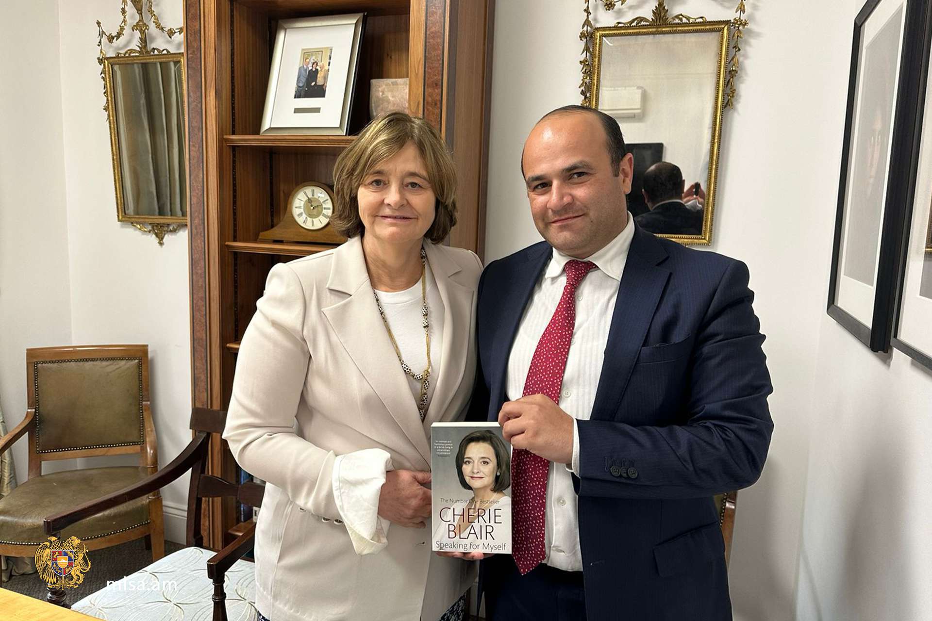 Մեծ Բրիտանիա կատարած աշխատանքային այցի շրջանակում Աշխատանքի և սոցիալական հարցերի նախարար Նարեկ Մկրտչյանը հանդիպում է ունեցել Մեծ Բրիտանիայի նախկին վարչապետ Թոնի Բլերի տիկնոջ Շերի Բլերի հետ, ով ղեկավարում է Կանանց հիմնադրամը։
