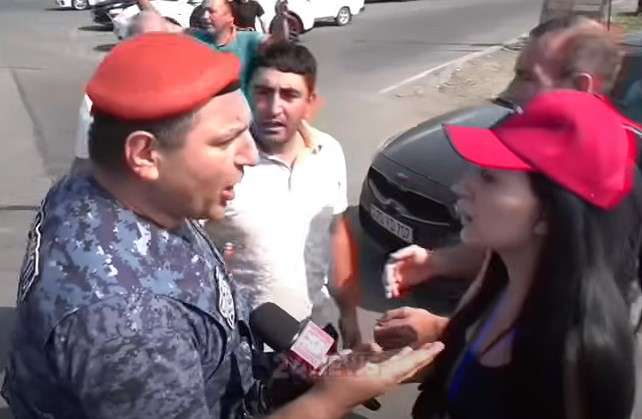 Ոստիկանը հրում է 24 News-ի թղթակցին, բղավում նրա վրա։
