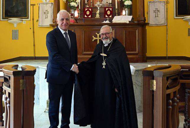 Եկեղեցու հոգևոր առաջնորդ Տեր Խաչատուրին ողջունելուց հետո նախագահը ծաղիկներ է դրել Հայոց ցեղասպանության զոհերի հիշատակին նվիրված խաչքարի մոտ, շրջայց կատարել եկեղեցում, ապա այցելել Սուրբ Աստվածածին եկեղեցու հարևանությամբ գործող Պարսամյան կրթահամալիր: