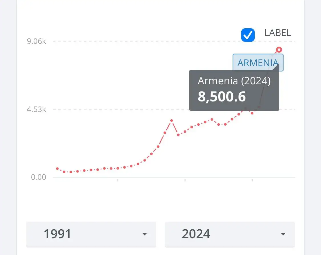 2024-ին 1 շնչի հաշվով ՀՆԱ-ն կազմել է 8501$ այսինքն 2017-ի համեմատ՝ 7 տարում աճել է 4632$-ով կամ տարեկան միջինը աճել է մոտ 662$-ով։