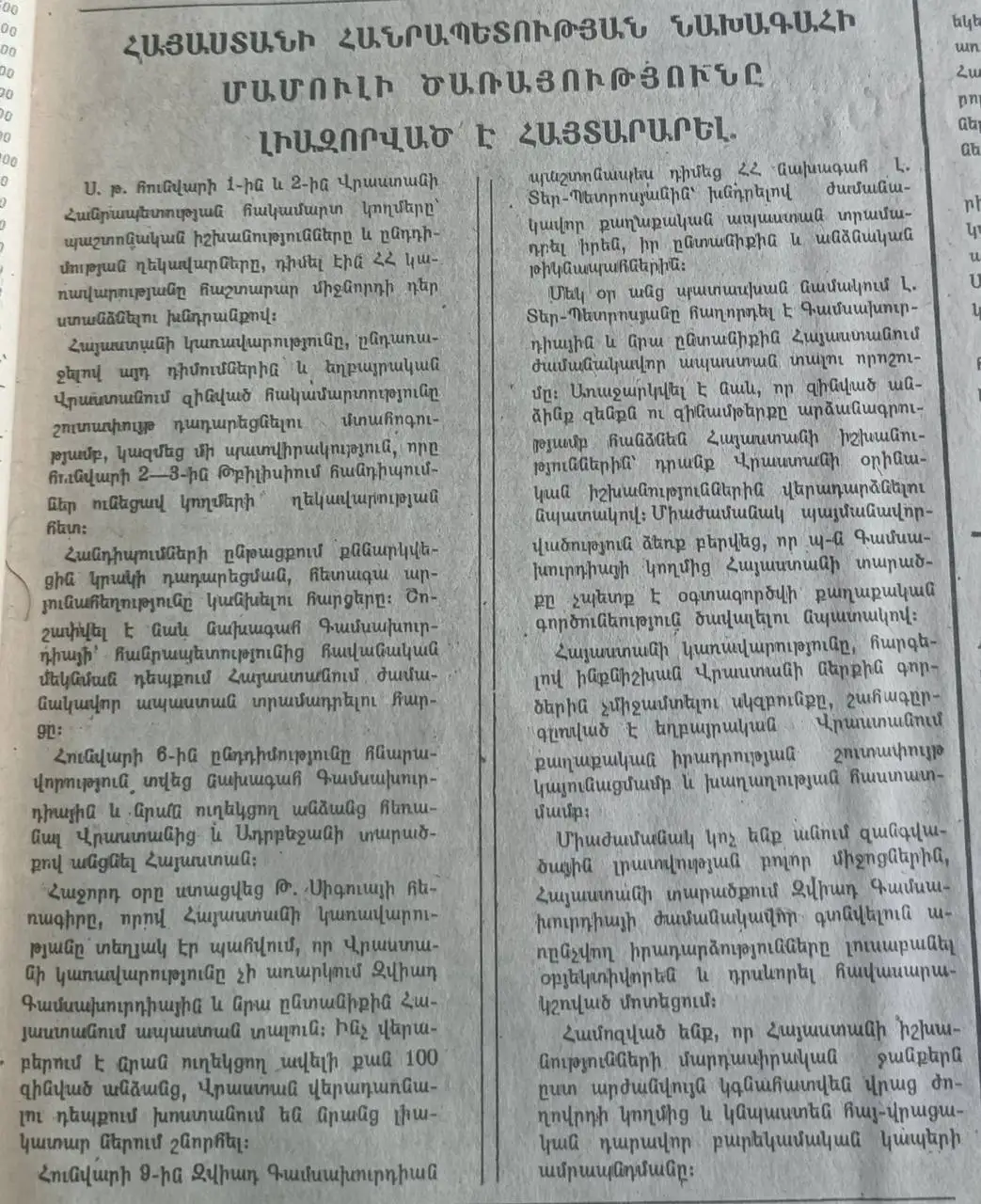 Radar Armenia-ն ներկայացնում է Հայաստանի նախագահի մամուլի ծառայության հայտարարությունը, որը հրապարակվել է 1992թ. հունվարին՝ «Հայաստան Հանրապետություն» օրաթերթում։