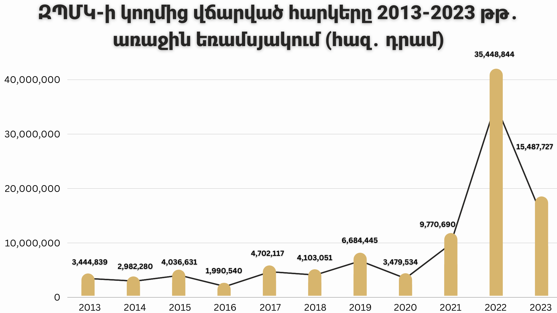 Նկատի ունենալով վերը նշված գործոններն ու դրանց համակցությունը՝ 2023թ. ԶՊՄԿ-ի կողմից վճարված 15.49 միլիարդ դրամի չափով հարկը նույնպես աննախադեպ ցուցանիշ է։ Առավել արտահայտիչ ու համեմատական պատկեր ունենալու նպատակով Radar Armenia-ն ի մի է բերել 2013-2022թթ. ընթացքում ԶՊՄԿ-ի վճարած հարկերը՝ նախ տարվա առաջին եռամսյակի, ապա ամբողջ տարեկան կտրվածքով։