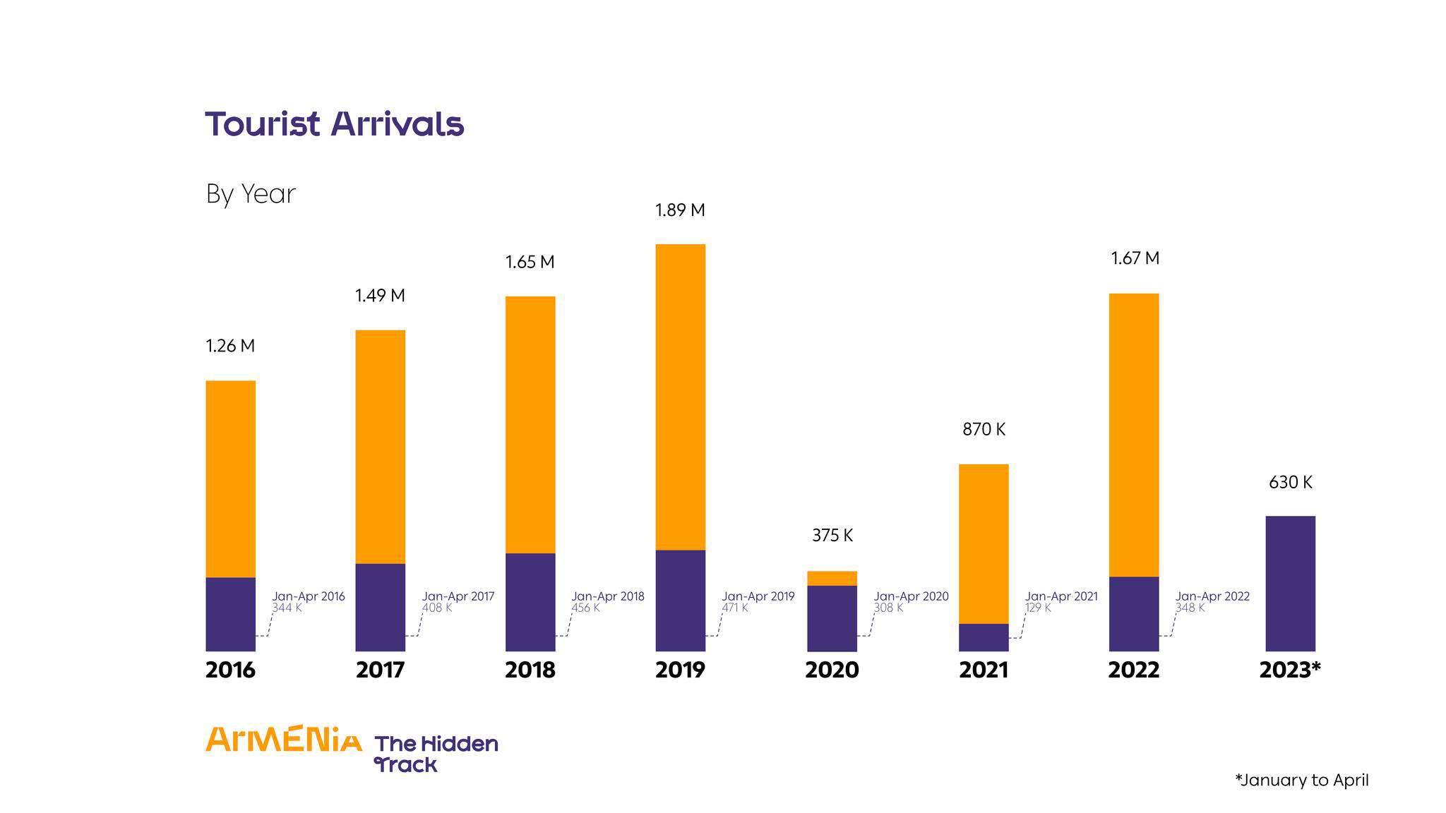 Նշվում է, որ տարվա առաջին չորս ամիսներին Հայաստան է այցելել 630․000 զբոսաշրջիկ, որը մոտ 34%-ով գերազանցում է 2019թ․ ցուցանիշը։