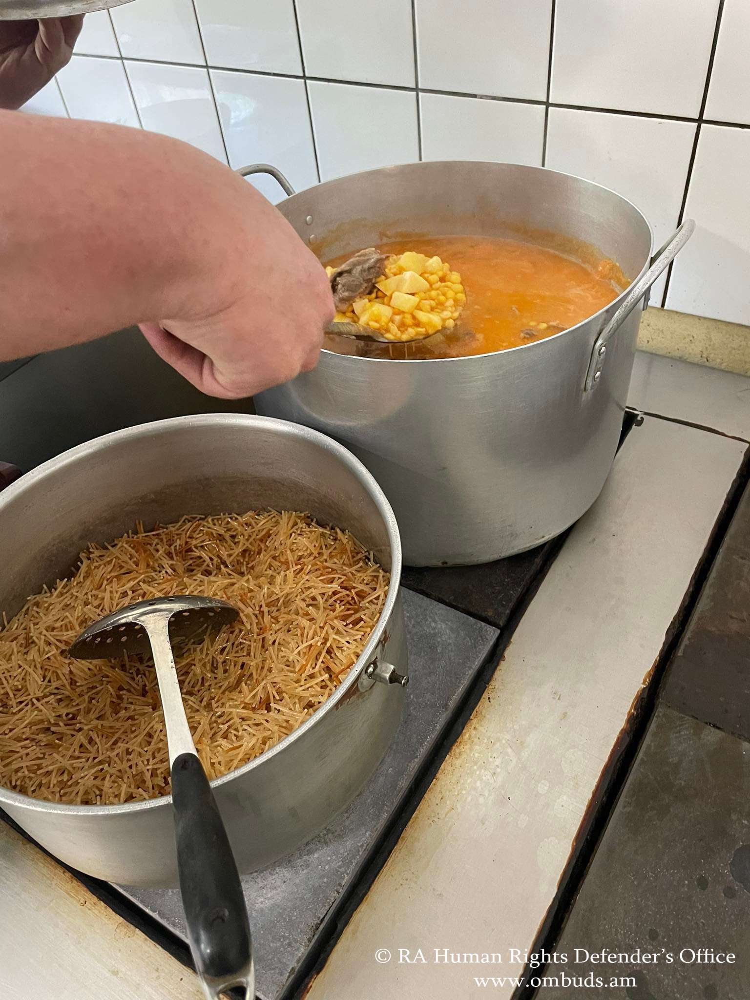 Ճաշարանում ու խոհանոցում արձանագրվել են աշխատանքի կազմակերպման խնդիրներ։ Խոհանոցում առկա է անձակազմի անհամաչափ ծանրաբեռնվածություն ու գործառույթների միաձուլում։ Այցի ընթացքում պատրաստված ուտեստների չափաբաժինները և սնվելու ժամերը հստակ նշված չեն եղել։ Պահպանված չեն եղել նաև սննդի նմուշառման՝ ՀՀ օրենսդրությամբ սահմանված պահանջները: