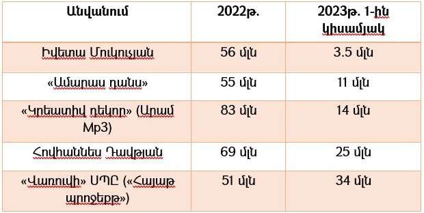 Radar Armenia-ն ներկայացնում է շոու-բիզնեսի հայտնի ներկայացուցիչների՝ ինքնակամ շրջանառություն հայտարարագրածների ցանկը 2022 թվականի և 2023 թվականի առաջին եռամսյակի արդյունքներով: