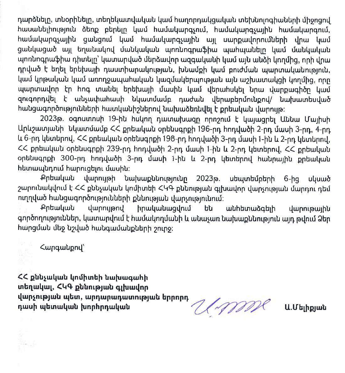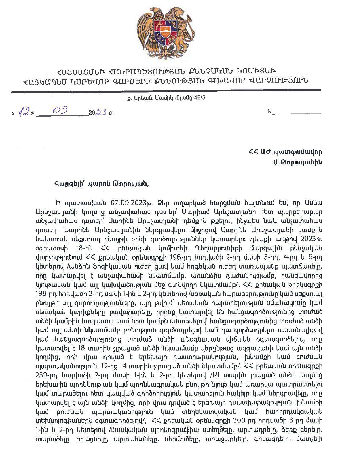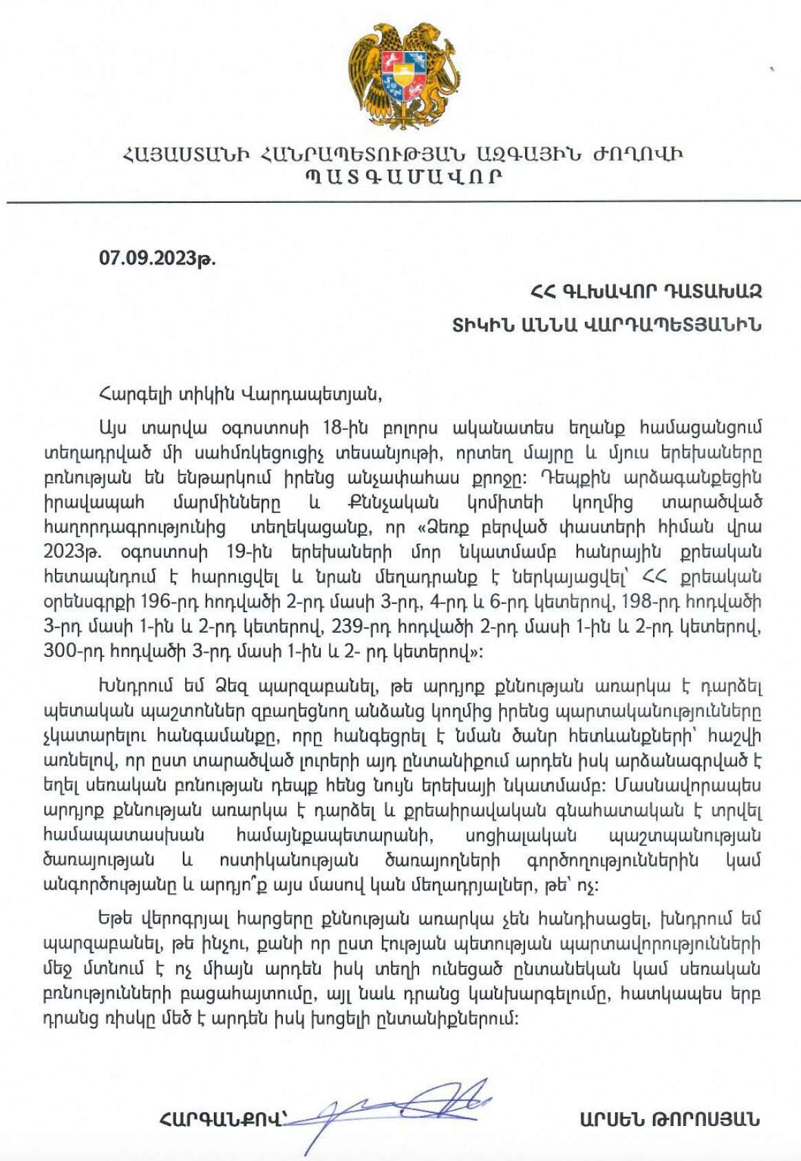 «Վերջերս Գավառ քաղաքում երեխայի նկատմամբ տեղի ունեցած բռնության դեպքի կապակցությամբ հարցում էի ուղարկել գլխավոր դատախազին, որի պատասխանը ստացել եմ Քննչական կոմիտեից: Հանրային հաշվետվողականության և անհատի ու հանրության համար հարցի խիստ կարևորության տեսանկյունից հարկ եմ համարում կիսվել այդ նամակները ձեզ հետ: