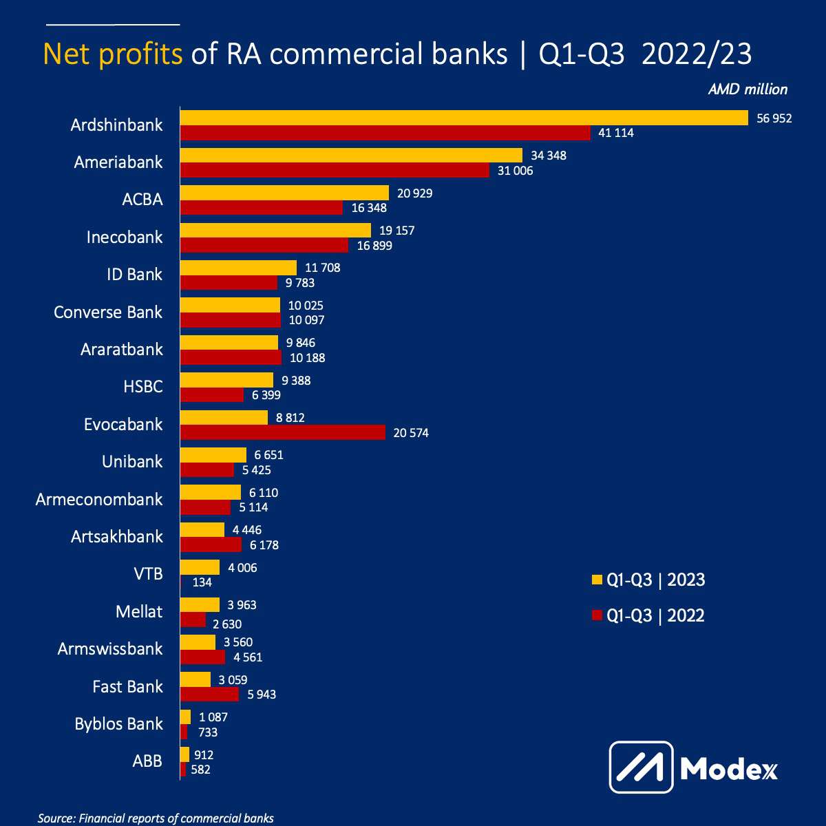 «Մոդեքս» տնտեսագիտական վերլուծական կենտրոնը ներկայացրել է ՀՀ առևտրային բանկերի զուտ շահույթը՝ 2022/23թթ I-III եռամսյակին։