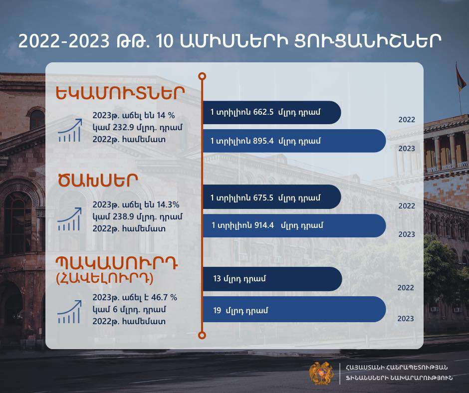 ՀՀ Ֆինանսների նախարարությունը հրապարակվել է ՀՀ 2023 թվականի տասն ամիսների (հունվար-հոկտեմբեր) պետական բյուջեի կատարման մասին տեղեկատվությունը։