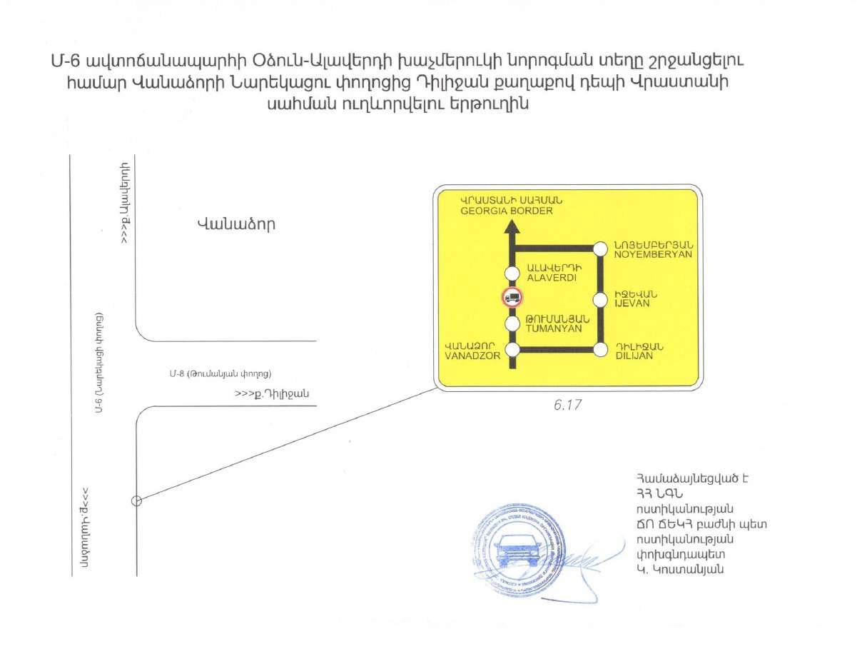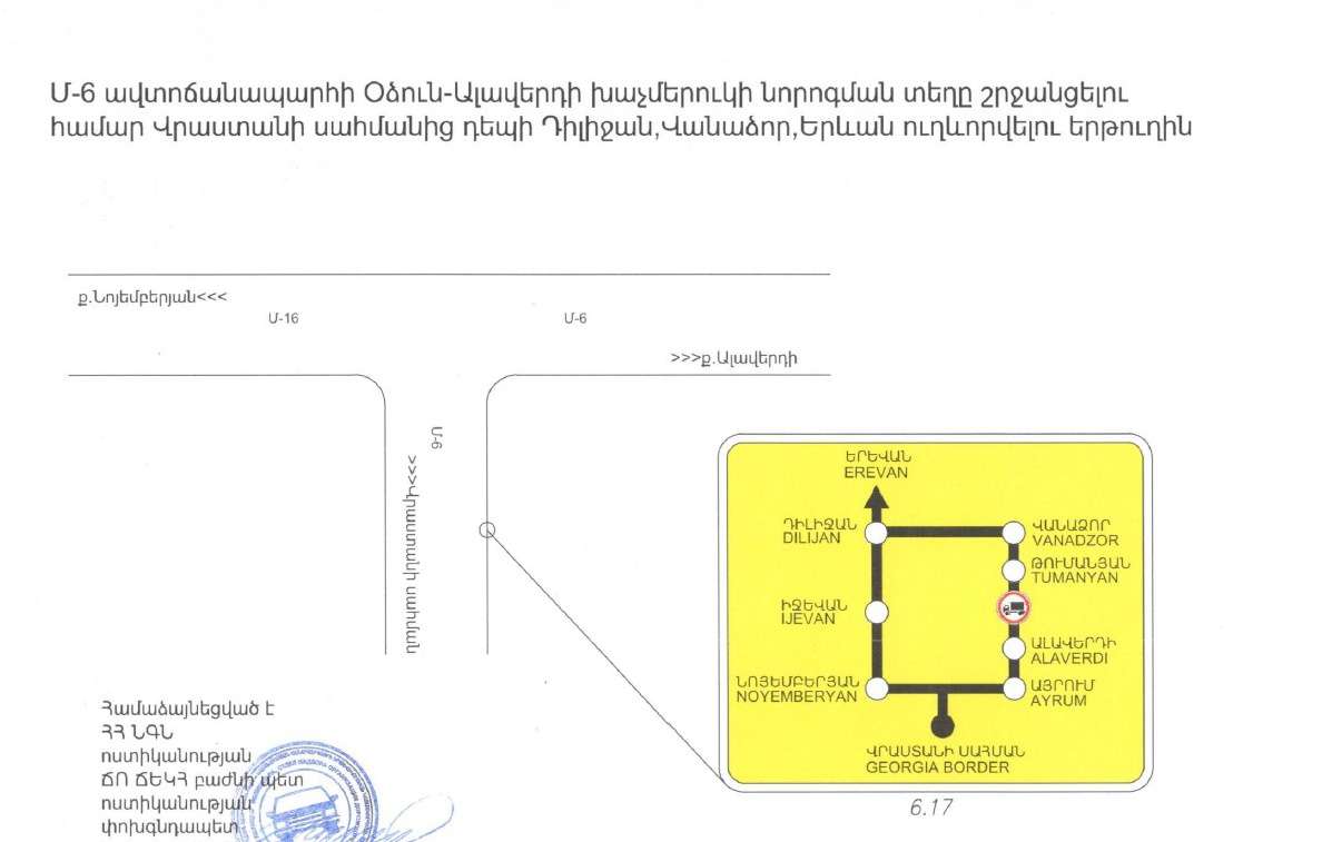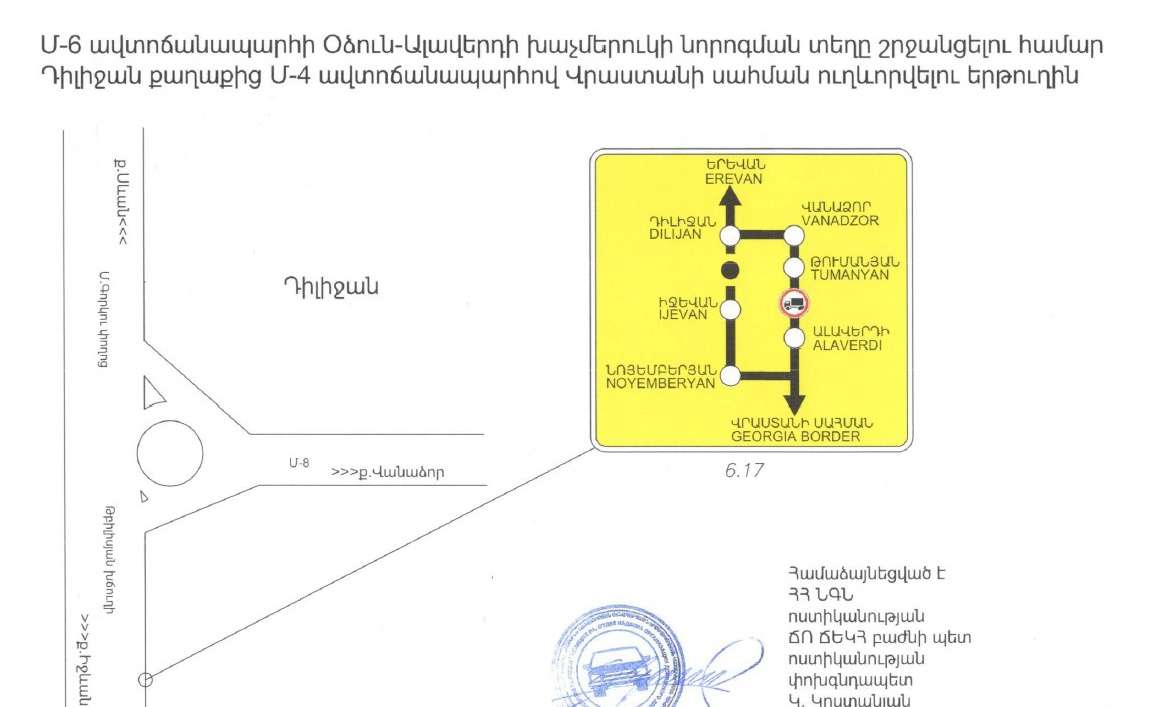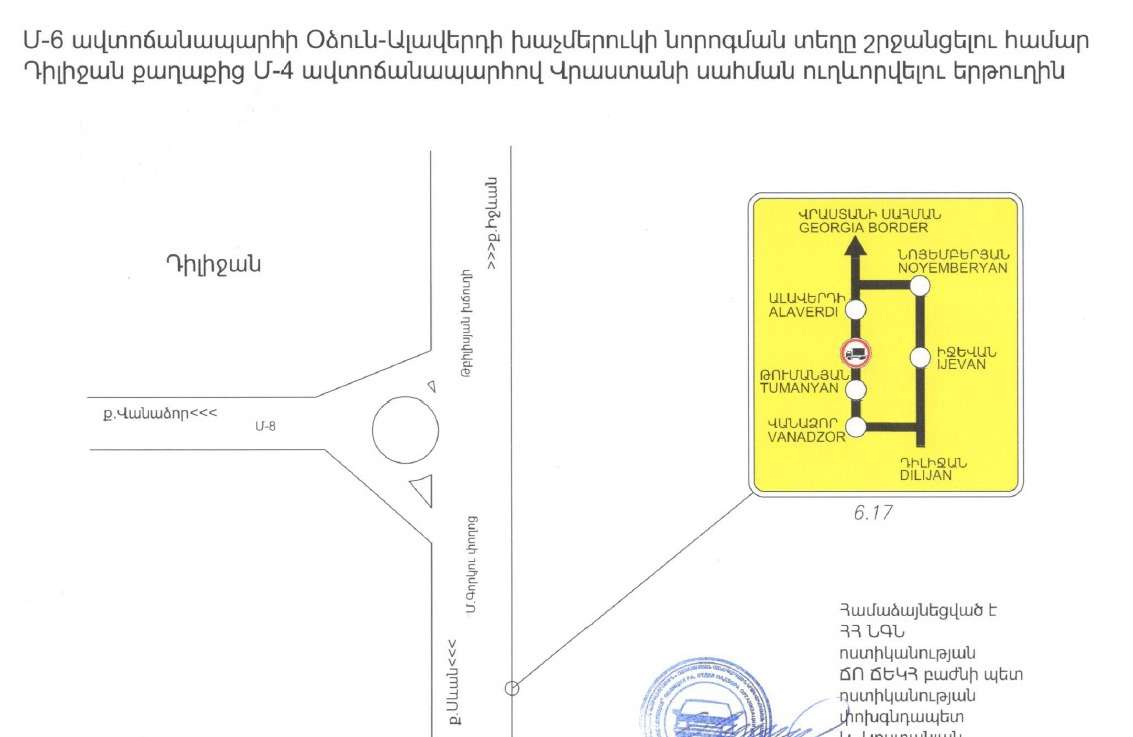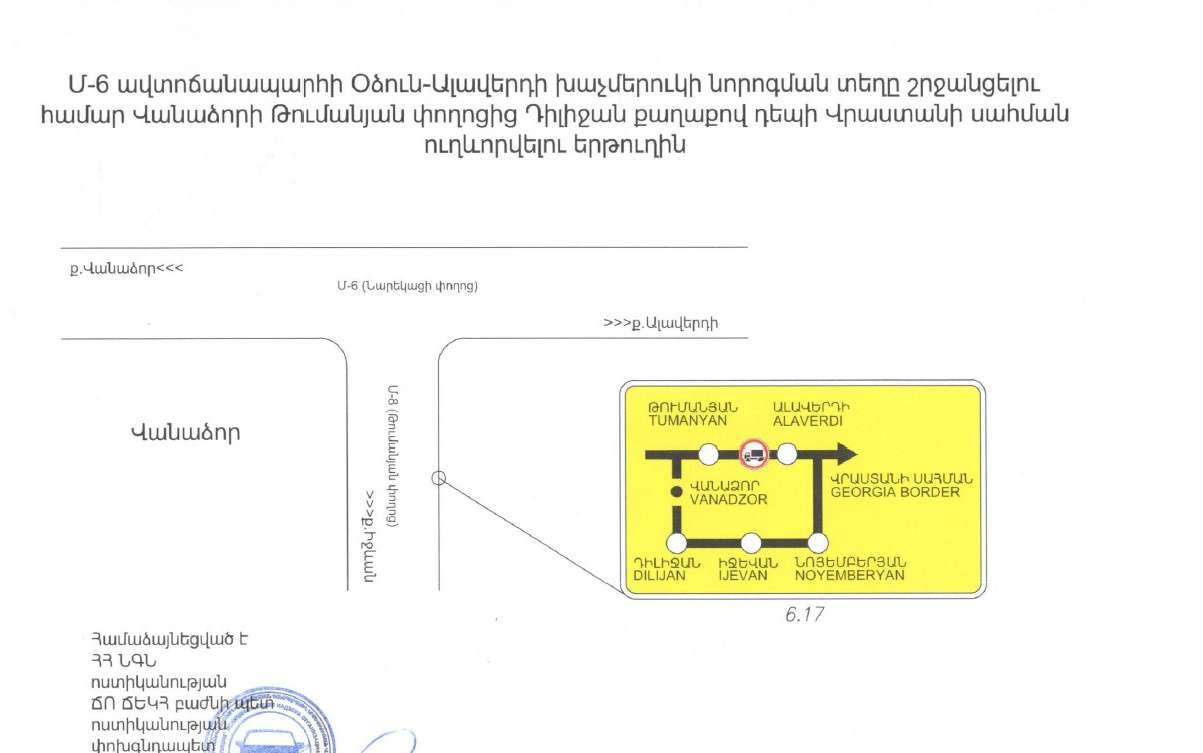 «Տեղեկացնում ենք‚ որ Օձունի խաչմերուկում իրականացվող հիմնանորոգման աշխատանքներով պայմանավորված՝ մինչև 2024թ․ փետրվարի 15-ը ժամանակավորապես արգելվելու է կցորդով կամ կիսակցորդով բեռնատար տրանսպորտային միջոցների, ինչպես նաև զբոսաշրջիկներ տեղափոխող ավտոբուսների երթևեկությունը Մ-6, Վանաձոր-Ալավերդի-Վրաստանի սահման միջպետական նշանակության և Հ-35, (Մ-6)-Օձուն-Արևածագ (Հ-24) հանրապետական նշանակության ավտոճանապարհի հատման տեղամասում։