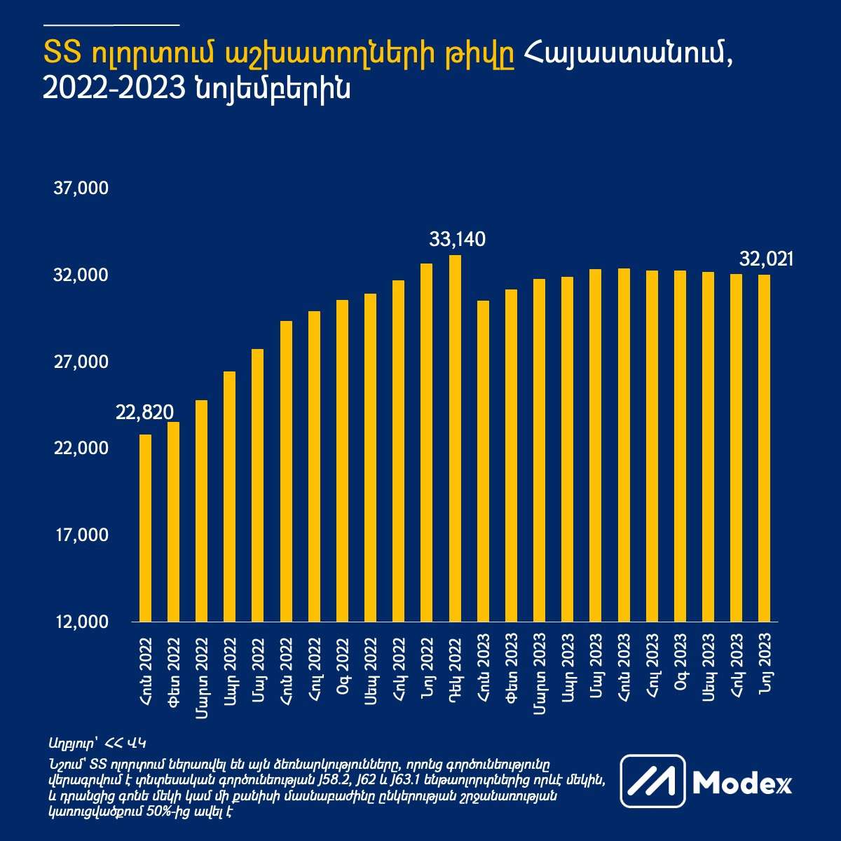 Պայմանավորված դրամի շարունակական արժևորված լինելու հանգամանքով, ռուսաստանցի ՏՏ միգրանտների արտահոսքով, ինչպես նաև համաշխարհային ՏՏ ոլորտում պահանջարկի անկմամբ և ներդրումների կրճատմամբ՝ 2023թ-ի տարեսկզբին Հայաստանի ՏՏ ոլորտի աշխատողների թիվը նվազել է, ապա որոշակիորեն աճելով կայունացել 32 հազ․-ի շուրջ։