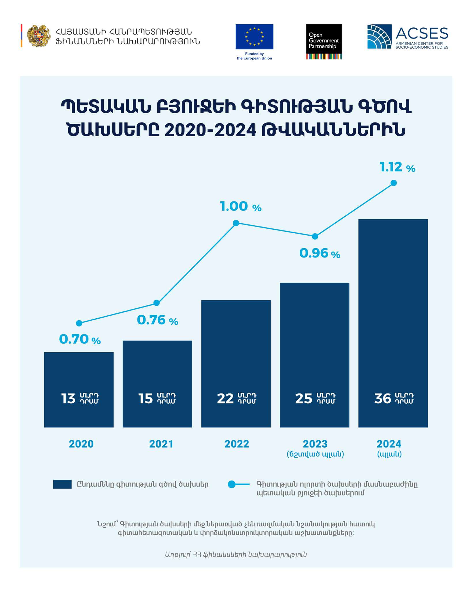 ՀՀ կառավարությունը նախատեսում է 2024 թվականին գիտության ոլորտին հատկացնել շուրջ 36 միլիարդ դրամ, ինչը մոտ 43%-ով ավել է, քան 2023 թվականի համար կառավարության ճշտված ծրագրով նախատեսված ցուցանիշը և 2․7 անգամ ավել է, քան 2020 թվականինը։
