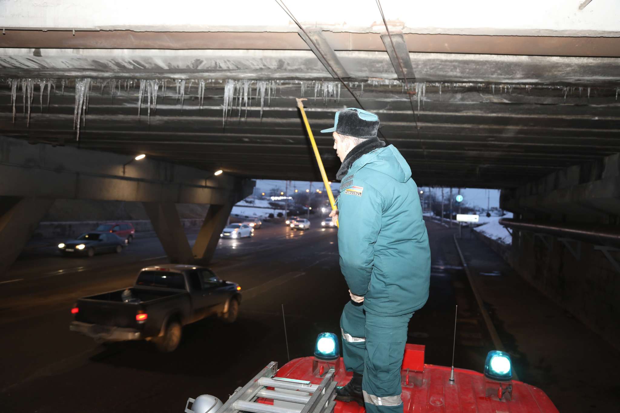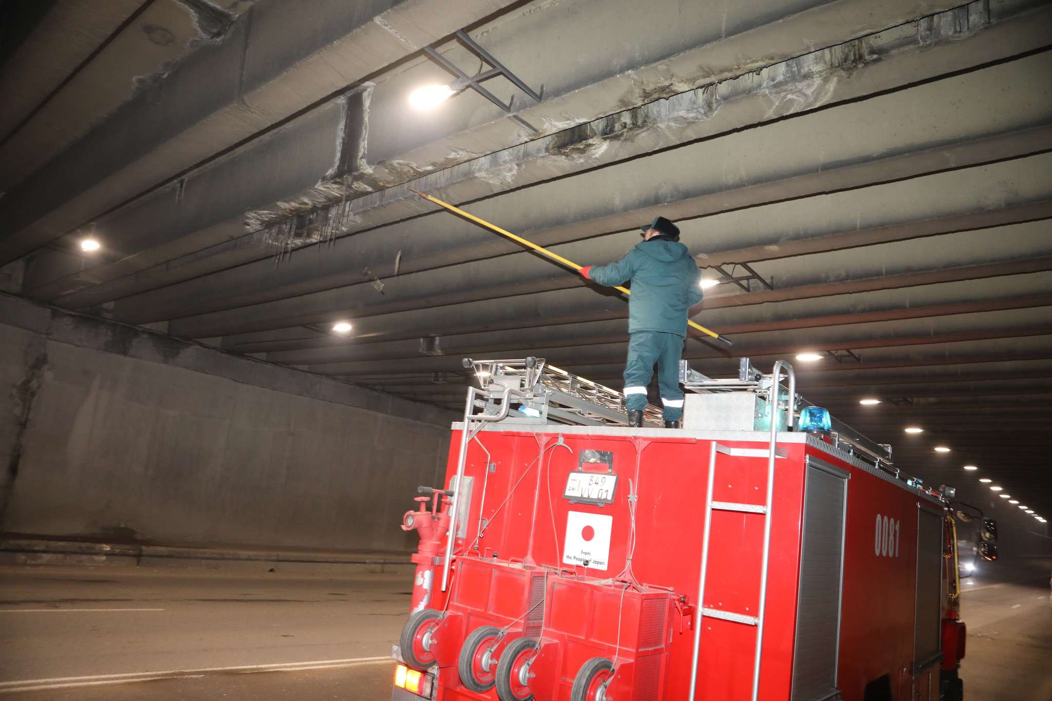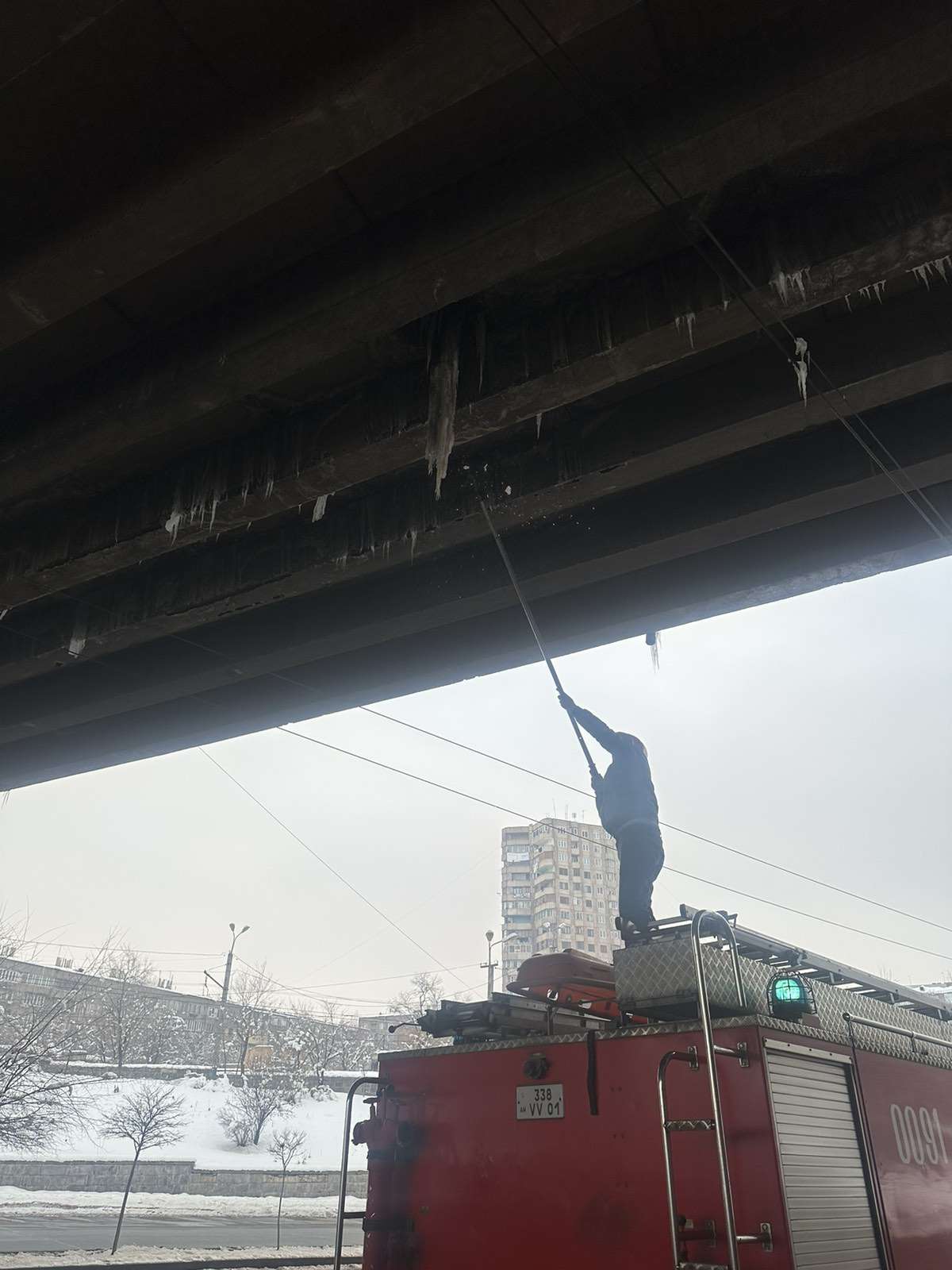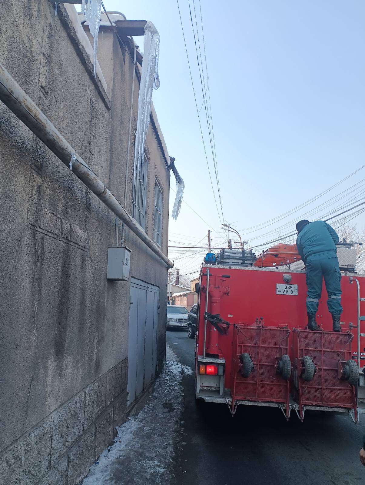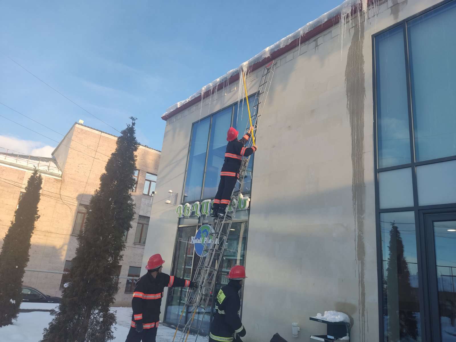 Փրկարարները, հատուկ տեխնիկայի միջոցով, հասարակական նշանակություն ունեցող շինությունների և բազմաբնակարան շենքերի տանիքներից, կամուրջներից, թունելներից և վերգետնյա անցումներից իրականացնում են կախված սառցալեզվակների և ջրորդաններում գոյացած սառույցի հեռացման աշխատանքներ։