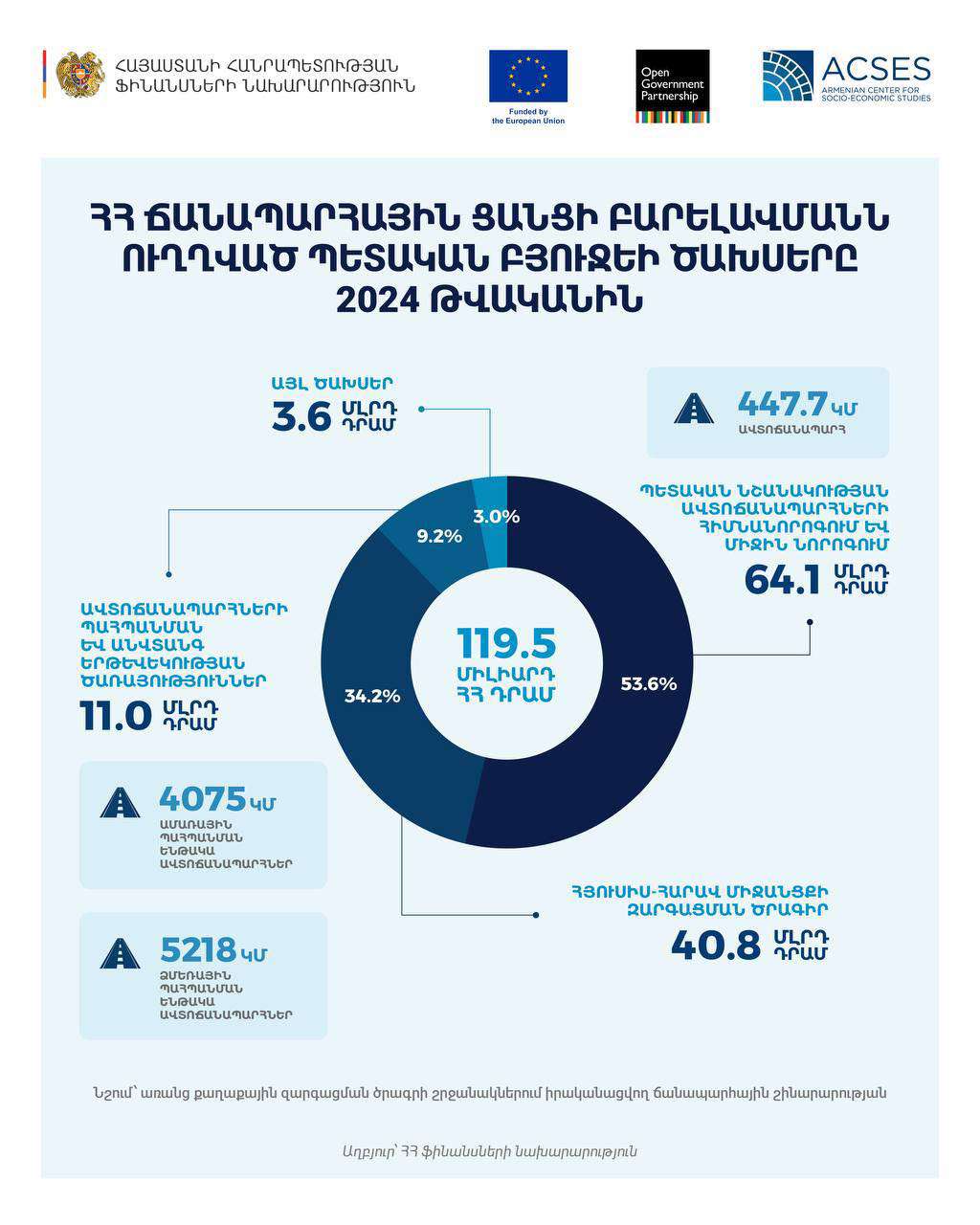 ՀՀ կառավարությունը նախատեսում է 2024 թվականին ճանապարհային ցանցի բարելավման համար հատկացնել 119 միլիարդ 530 միլիոն դրամ կամ պետական բյուջեի ծախսերի ավելի քան 3.7%-ը։