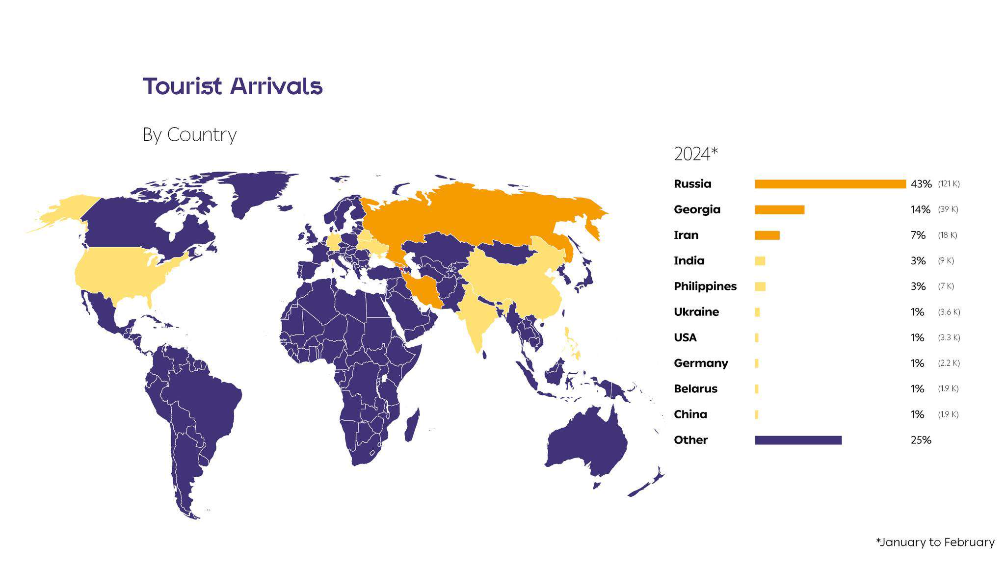 2023 թ․ փետրվար ամսին դեպի Հայաստան առավել շատ զբոսաշրջային այցելություններ գրանցվել են Ռուսաստանից (43%), Վրաստանից (14%) և Իրանից (7%):