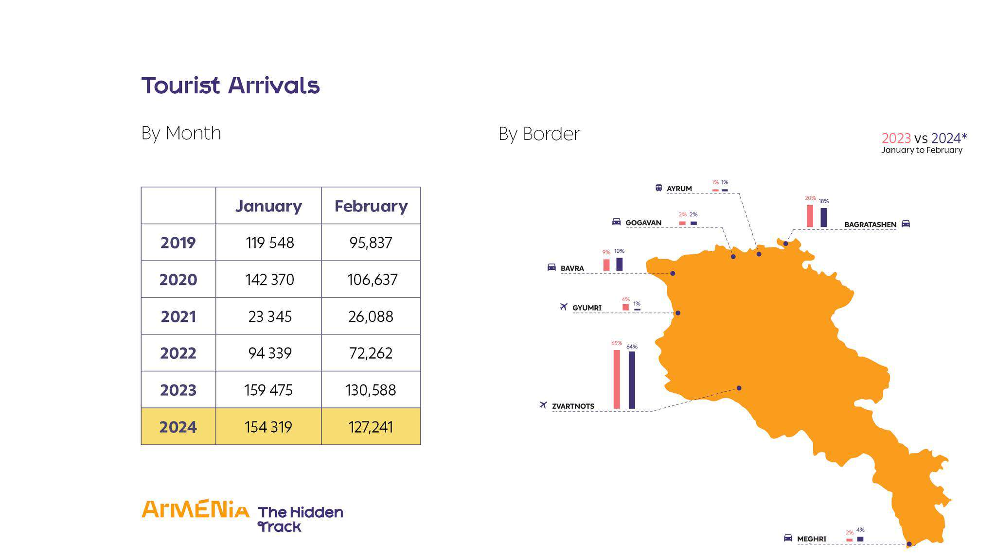 Ընթացիկ տարվա փետրվարին Հայաստան այցելել է 127 հազար 241 զբոսաշրջիկ՝ նախորդ տարվա նույն ժամանակահատվածի 130 հազար 588-ի համեմատ։