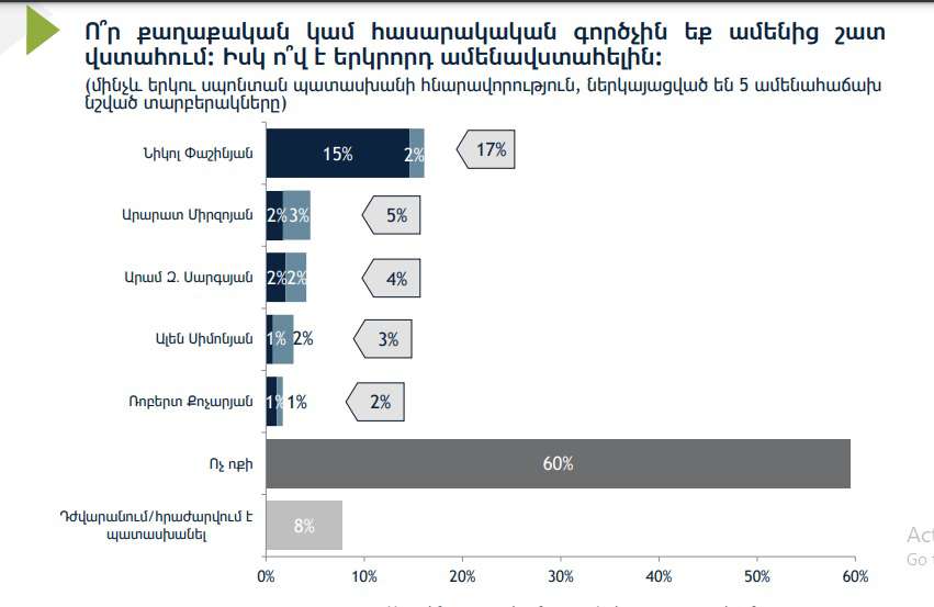 Ըստ այդմ, ո՞ր քաղաքական կամ հասարակական գործչին եք վստահում հարցին 17%–ը տվել է վարչապետ Նիկոլ Փաշինյանի անունը, երկրորդ տեղում Արարատ Միրզոյանն է՝ 5%, երրորդ տեղում՝ Արամ Զ. Սարգսյանը։ 60%–ը պատասխանել է, որ չի վստահում ոչ ոքի։