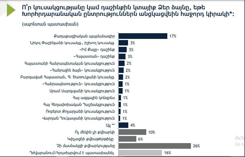 Հարցին՝ ո՞ր կուսակցությանը կամ դաշինքին կտայիք ձեր ձայնը, հարցվածների 17%–ը պատասխանել է՝ Քաղաքացիական պայմանագիր, 3%–ը՝ «Նիկոլ Փաշինյանի կուսակցություն», 3%–ը՝ «Իմ քայլը» դաշինք, 3%–ը՝ «Հայաստան» դաշինք, 2-ական տոկոսը տվել է ՀՀԿ, «Հանրային ձայն», ԲՀԿ կուսակցությունների անունը։