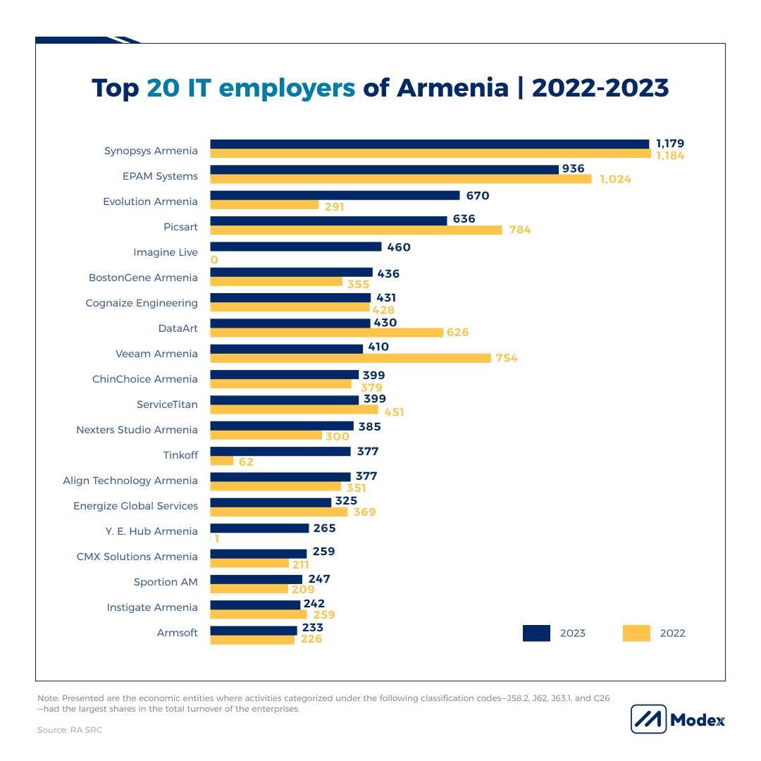 2023թ․ տարեվերջի դրությամբ՝ աշխատողների թվով առաջատարը Synopsis Armenia ընկերությունն էր՝ 1179 աշխատողով։ ՀՀ ՏՏ ոլորտի վերաբերյալ այս և ուրիշ փաստերի ավելի մանրամասն կարող եք ծանոթանալ Մոդեքս խորհրդատվական ընկերության պատրաստած «Տեղեկատվական տեխնոլոգիաների ոլորտը Հայաստանում 2023» զեկույցում: