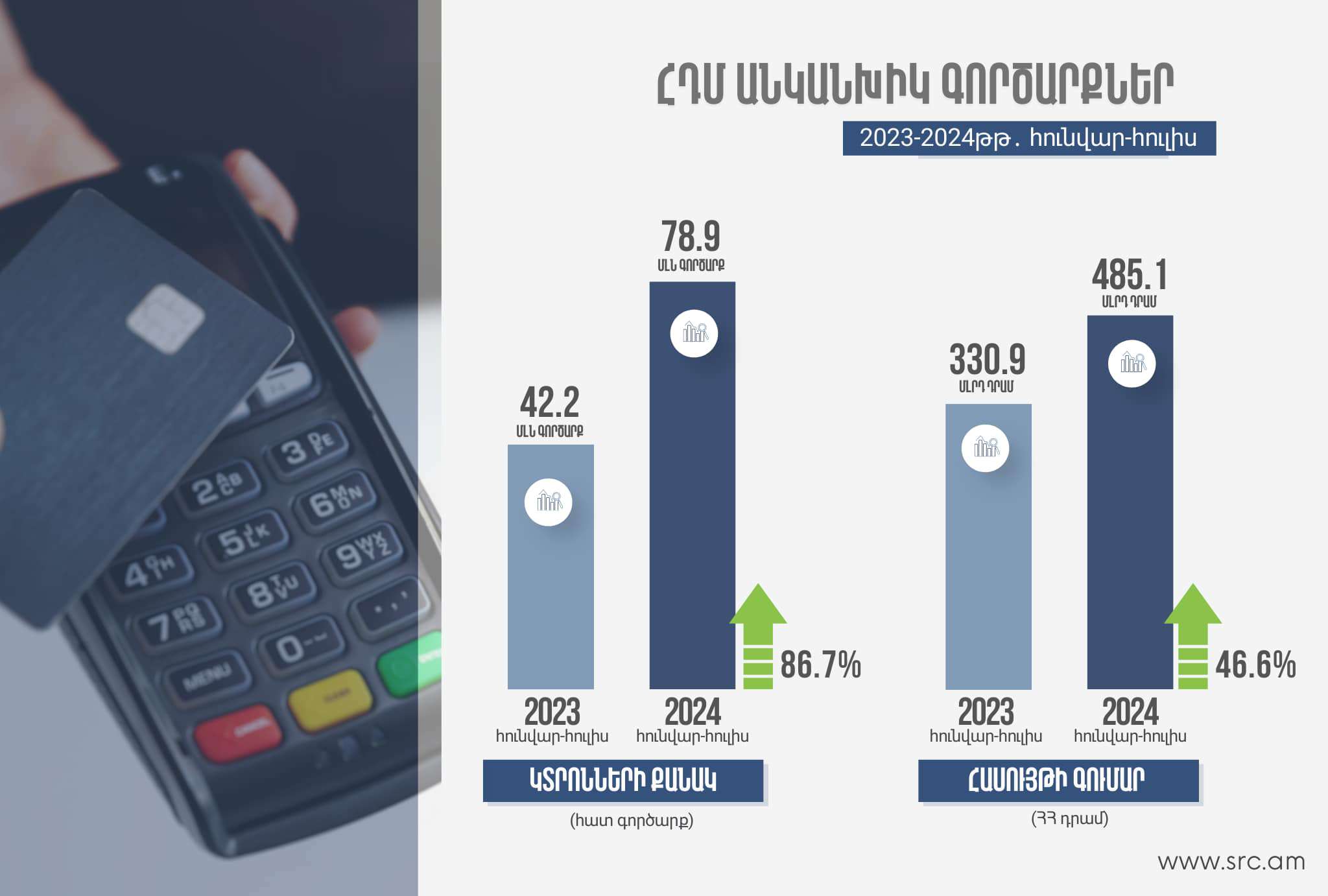 2024 թվականի հունվար-հուլիս ամիսների ընթացքում իրականացվել է 78.9 մլն անկանխիկ գործարք` 485.1 մլրդ ՀՀ դրամ արժեքով, ինչը ևս գերազանցել է նախորդ տարվա նույն ժամանակահատվածի ցուցանիշը` քանակային 36.6 մլն անկանխիկ գործարքով կամ 86.7%-ով, իսկ արժեքային` 154.2 մլրդ ՀՀ դրամով կամ 46.6%-ով: