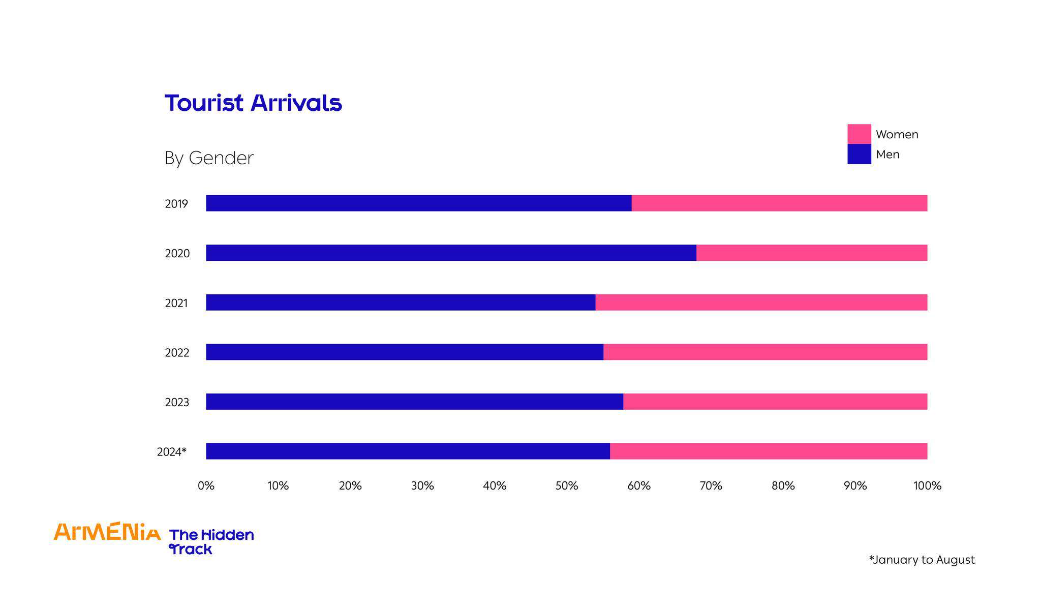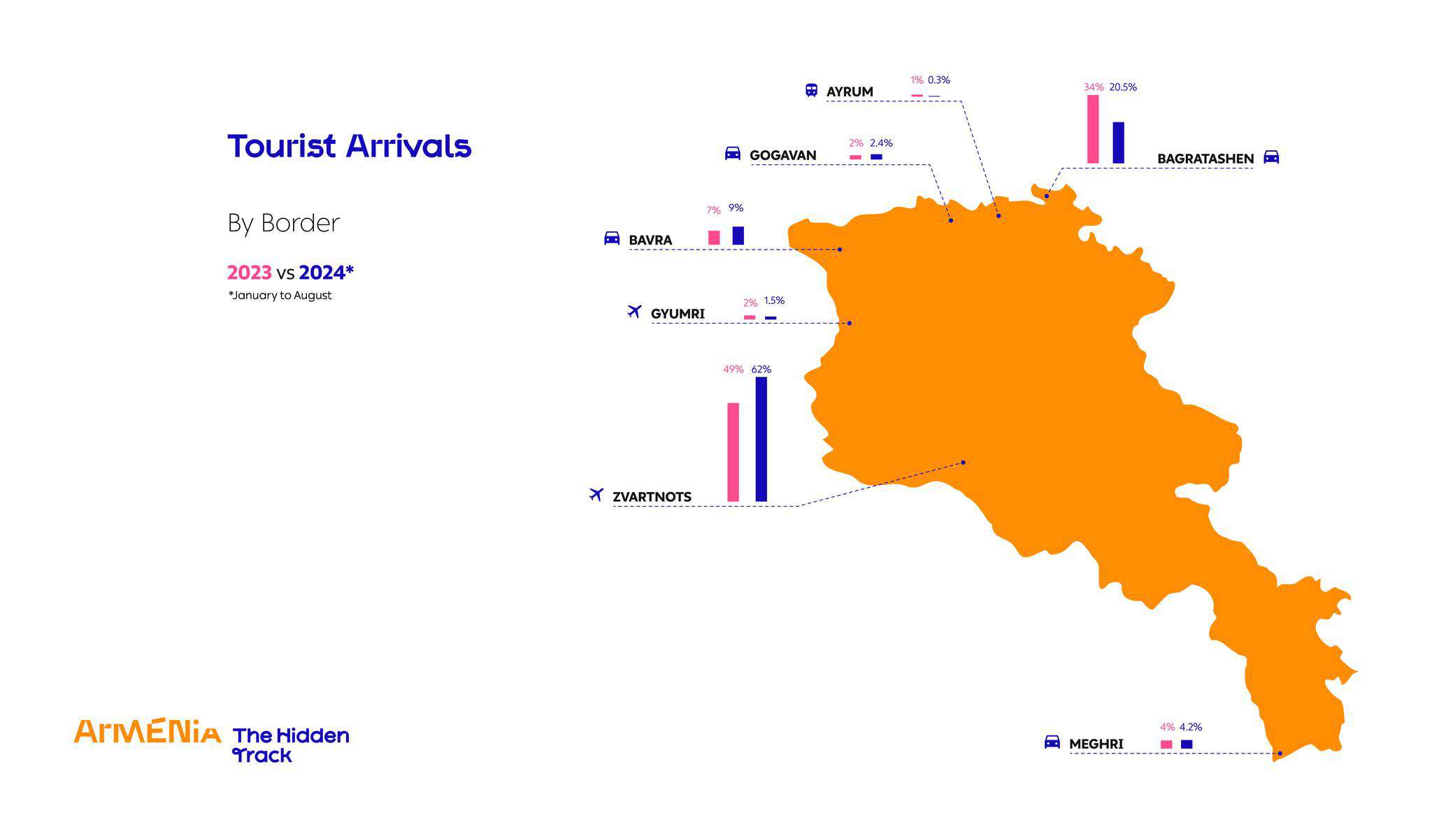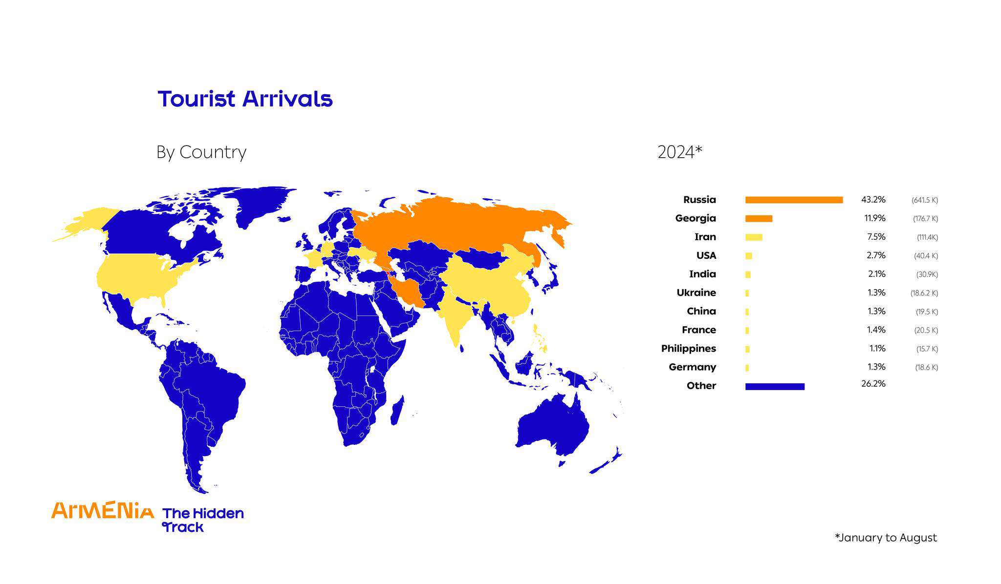 2024 թ․ հունվար-օգոստոս ամիսներին դեպի Հայաստան առավել շատ զբոսաշրջային այցելություններ գրանցվել են Ռուսաստանից (43.2%), Վրաստանից (11.9%) և Իրանից (7.5%):