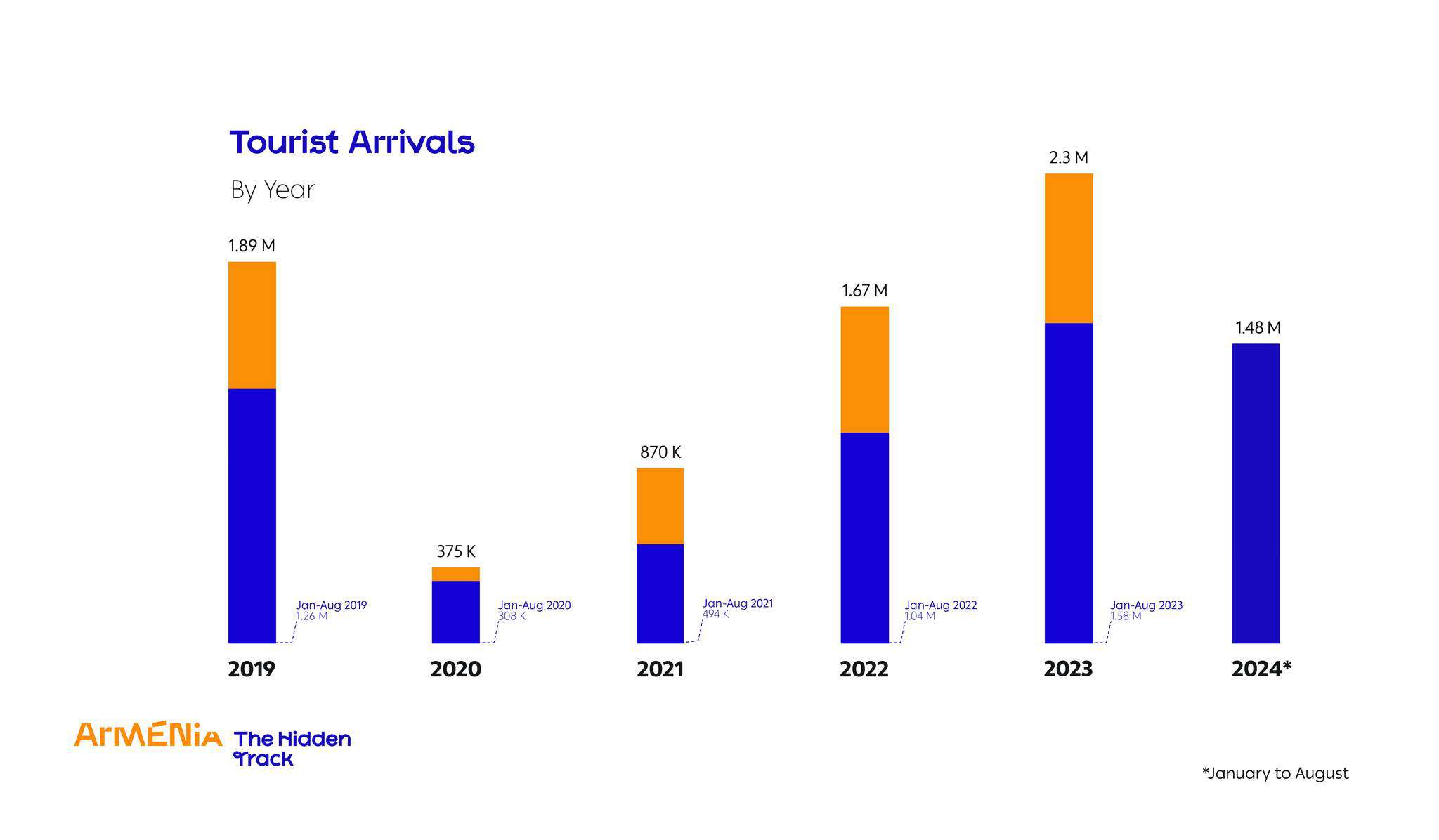 2024 թ-ի օգոստոսին Հայաստան այցելել է 300,919 զբոսաշրջիկ։ Նախորդ տարվա զբոսաշրջային այցելությունների թիվը կազմել է 328,486։