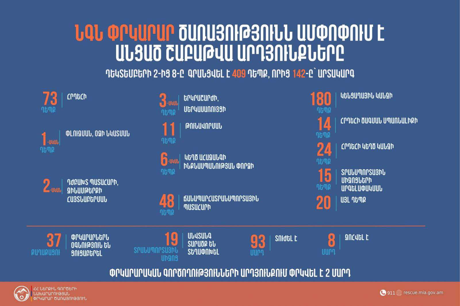 Դեկտեմբերի 2-8-ը ՆԳՆ ՓԾ ճգնաժամային կառավարման ազգային կենտրոնում գրանցվել է 409 դեպք, որից 142-ը՝ արտակարգ: