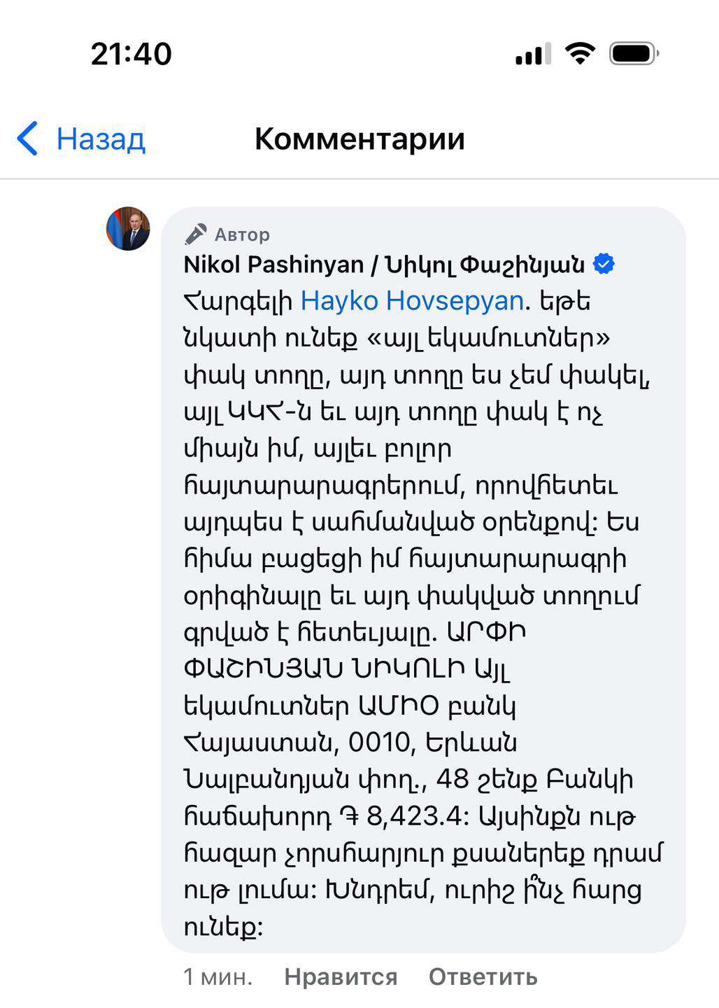 «Այսօր որոշեցի ժամանակ տրամադրել և վերջին գրառմանս տակ գրված մի քանի մեկնաբանությունների արձագանքել: Հարգելի օգտատերերից մեկը մի նյութ տեղադրեց, որը վերաբերվում է իմ և իմ ընտանիքի անդամների հայտարարագրերին: