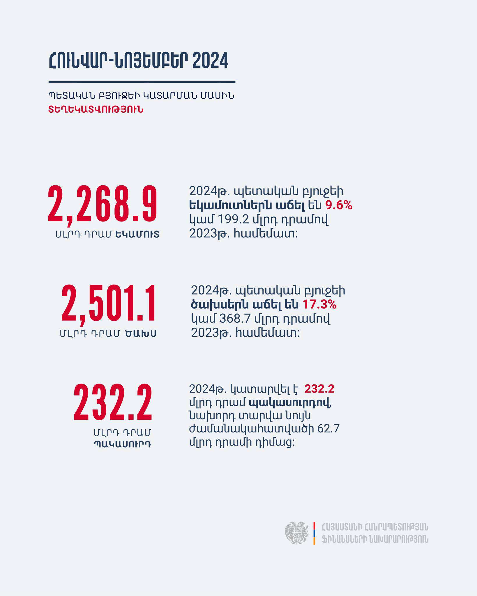 ՀՀ պետական բյուջեի ծախսերը կազմել են 2,501.1 մլրդ դրամ: Նախորդ տարվա նույն ժամանակահատվածի համեմատ պետական բյուջեի ծախսերն աճել են 17.3%-ով կամ 368.7 մլրդ դրամով: