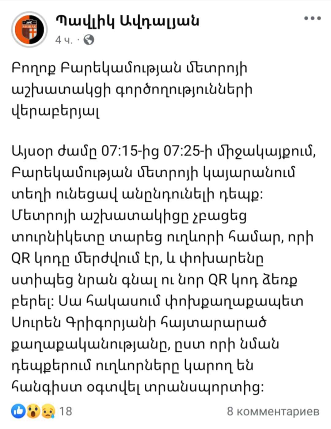 Նման չհիմնավորված և մետրոպոլիտենի աշխատակիցներին արատավորող հրապարակում կատարելուց առաջ փորձեք ճշտել իրական պատճառները՝ ապատեղեկատվությունից խուսափելու համար»։
