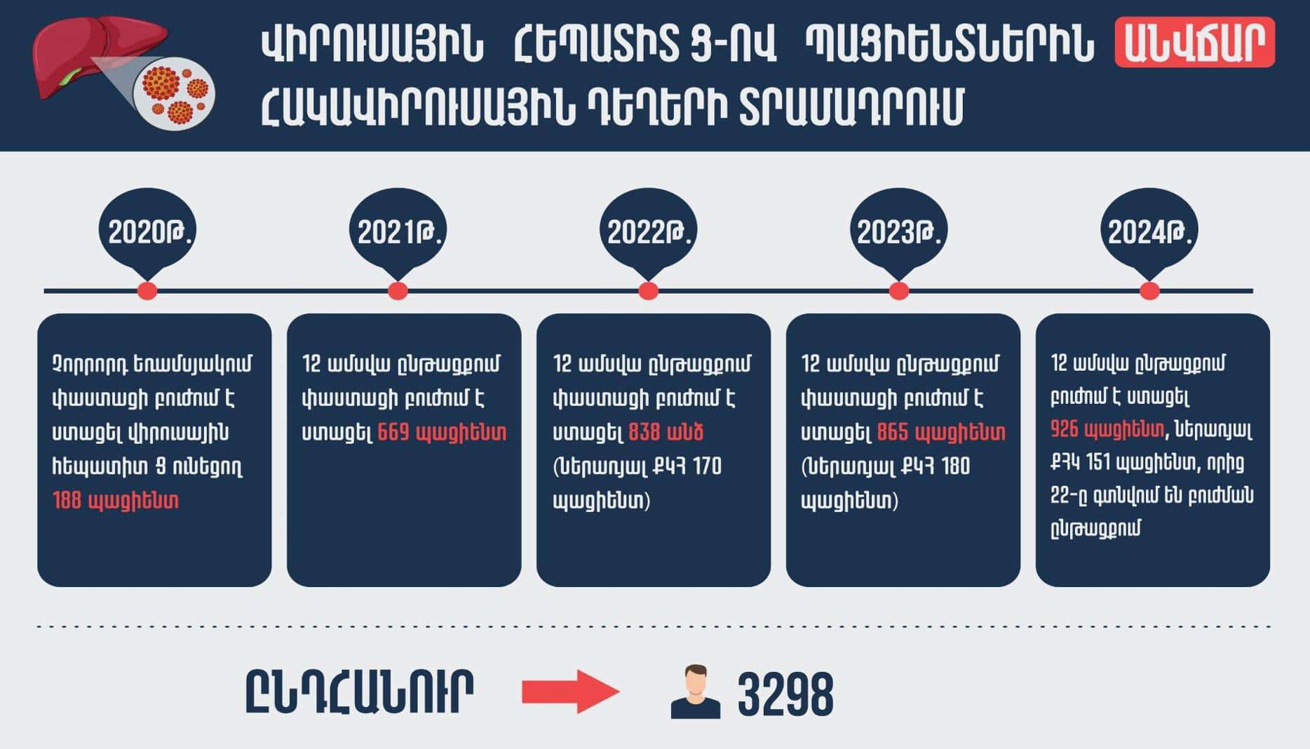 «2024թ. ՀՀ-ում հաշվառված «վիրուսային հեպատիտ Ց-ի հիվանդություն» ունեցող տարեկան շուրջ 1000 պացիենտի, այդ թվում` ՀՀ քրեակատարողական հիմնարկներում գտնվող, զուգակցված վարակներ (ՁԻԱՀ, ՄԻԱՎ, տուբերկուլոզ) ունեցող պացիենտներին, անխափան տրամադրվել են հակավիրուսային նորագույն դեղեր` անվճար կարգով: